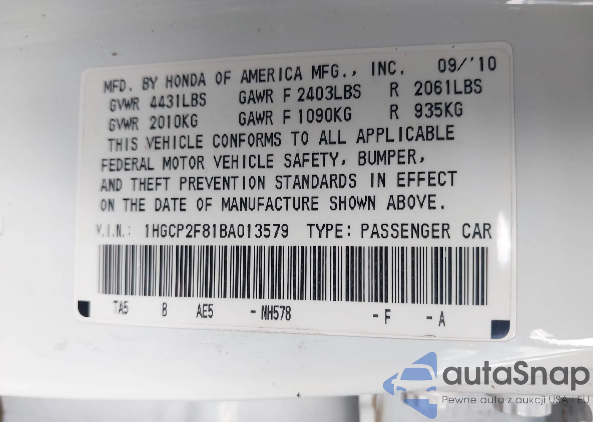 LOT: 43089699 VIN: 1HGCP2F81BA013579