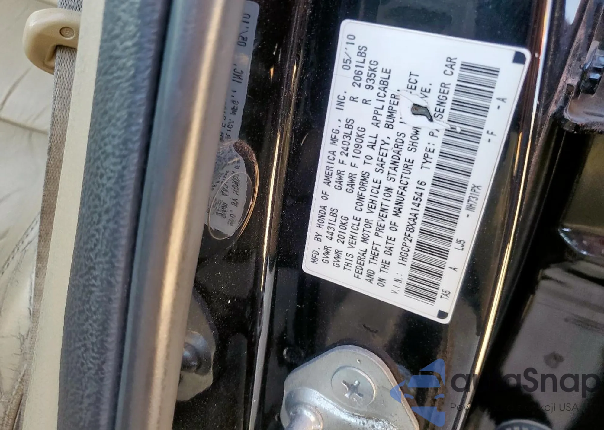 LOT: 92867345 VIN: 1HGCP2F8XAA145416