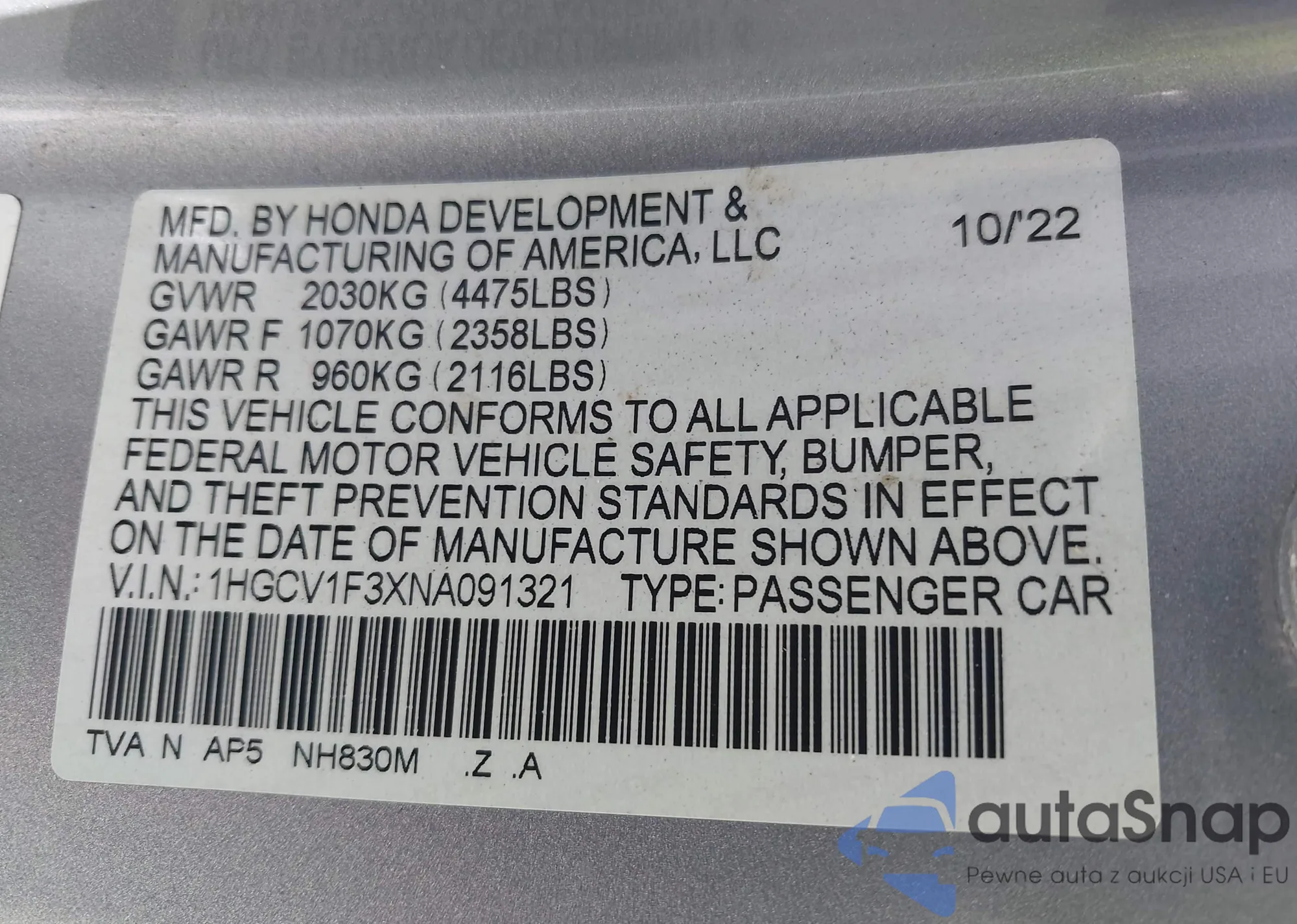 LOT: 43286112 VIN: 1HGCV1F3XNA091321