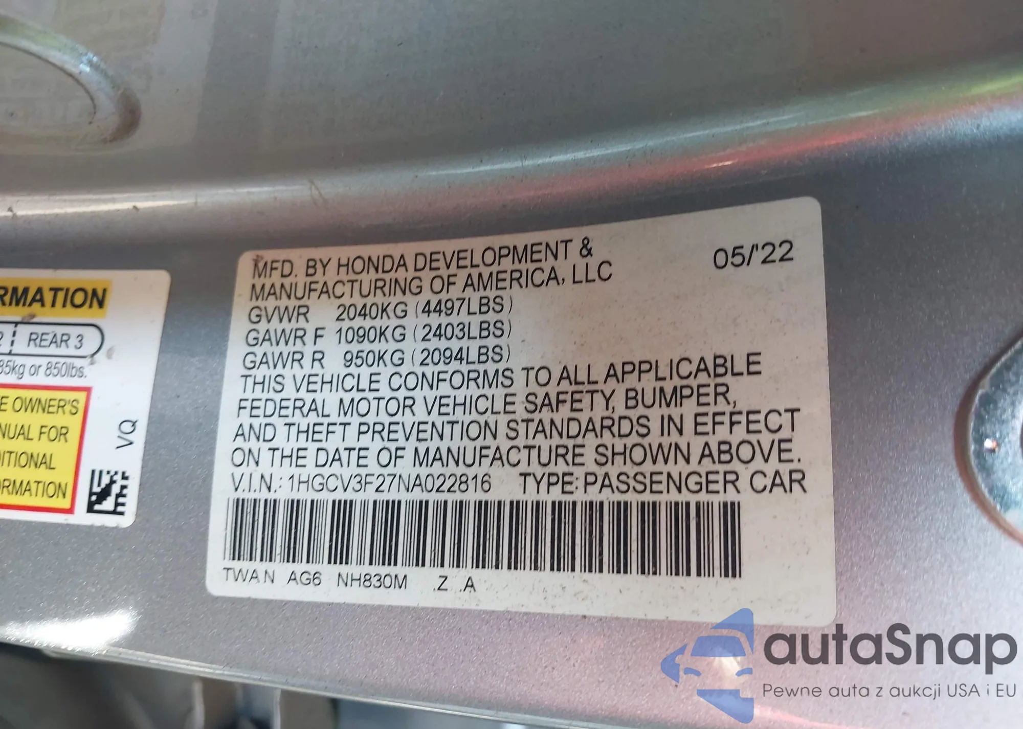 • VIN 1HGCV3F27NA022816