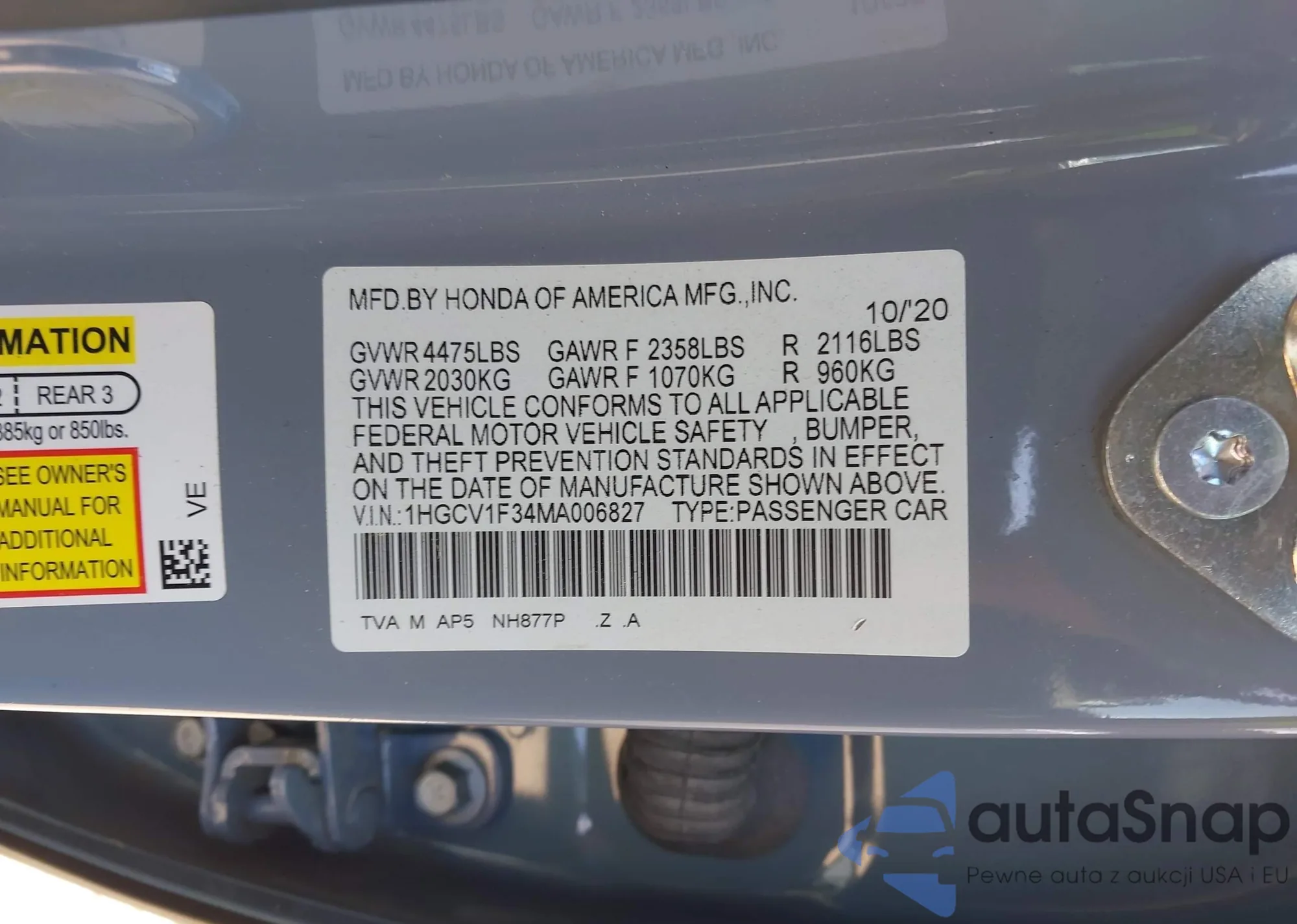 • VIN 1HGCV1F34MA006827