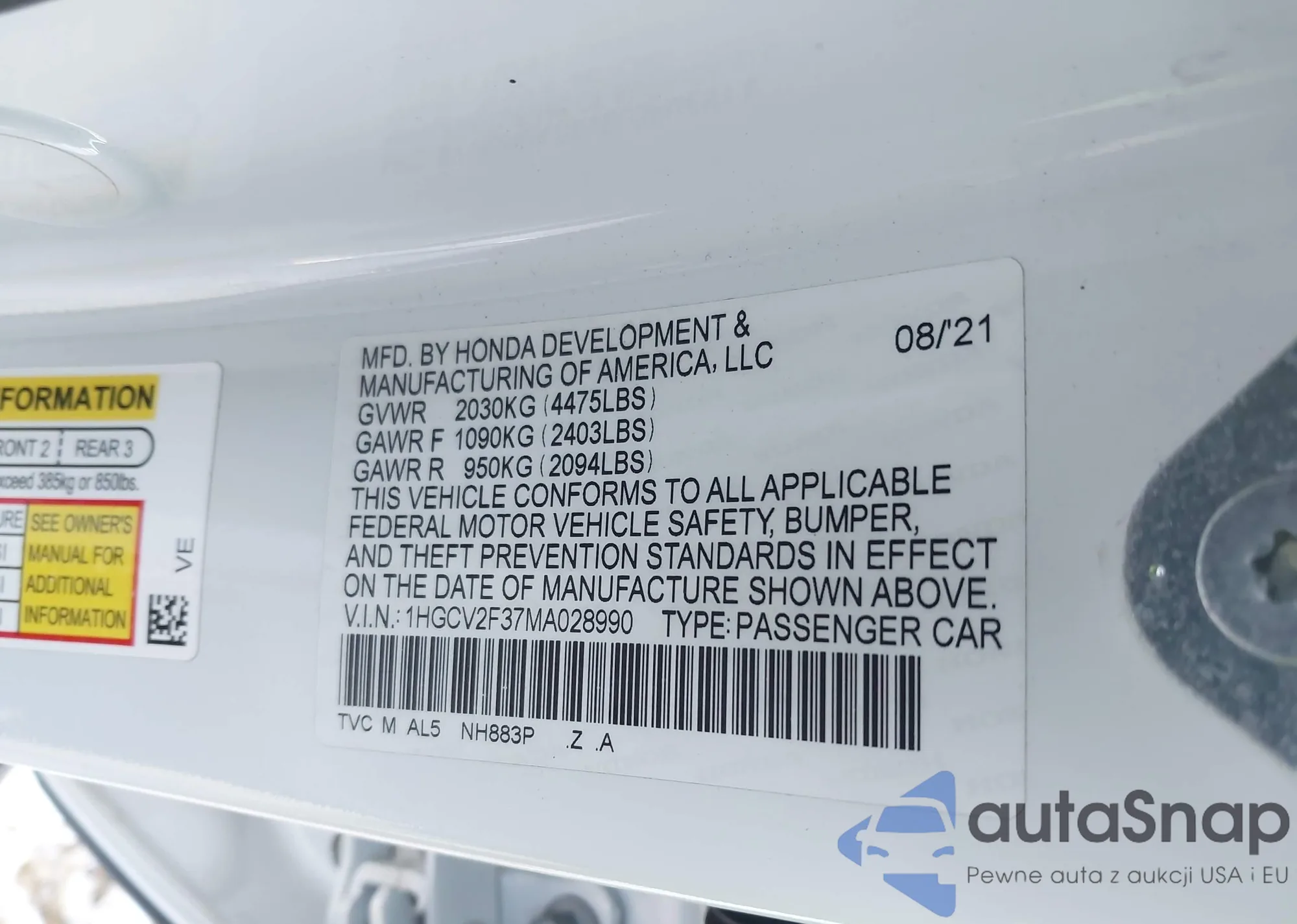 • VIN 1HGCV2F37MA028990