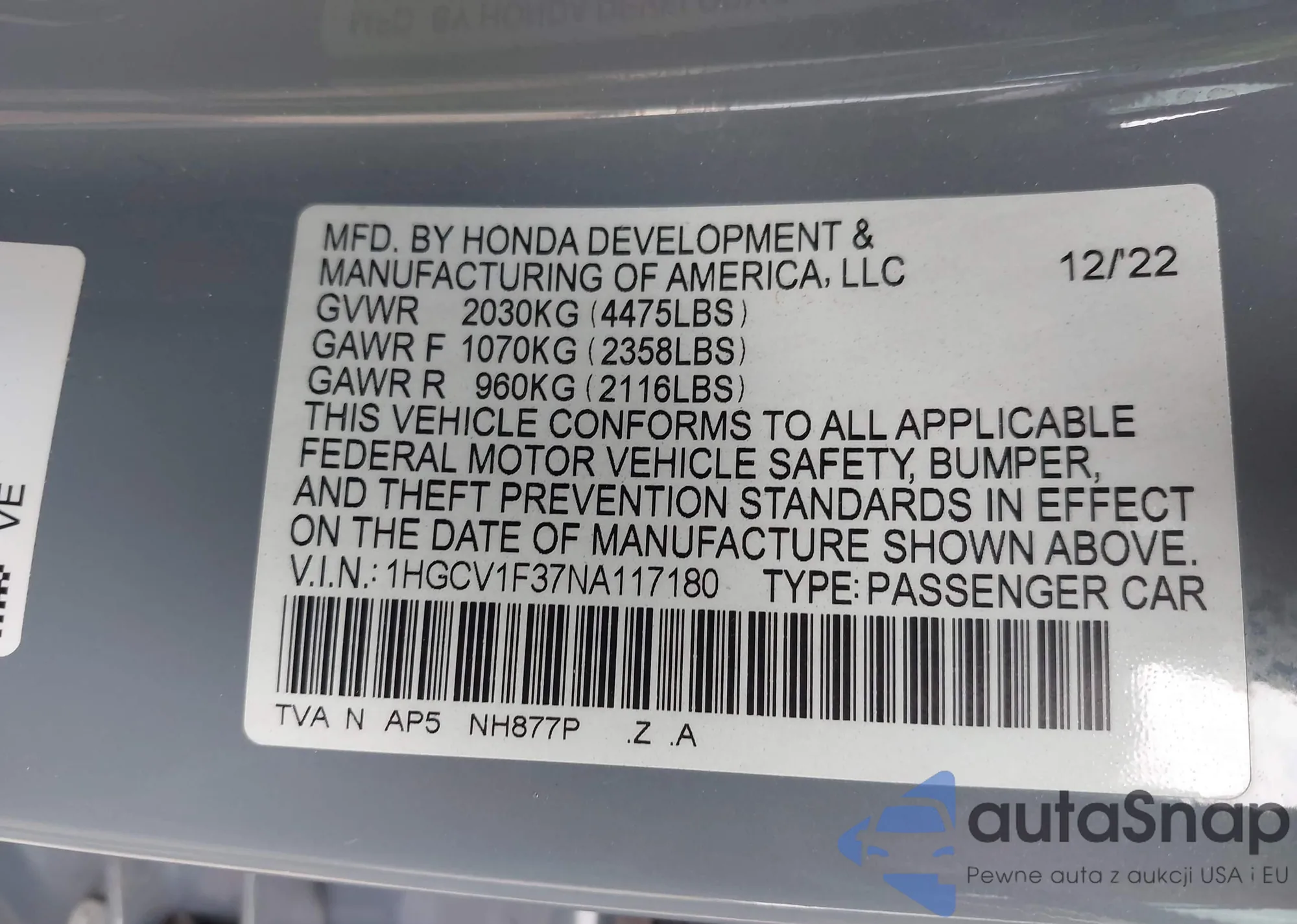 LOT: 43926959 VIN: 1HGCV1F37NA117180