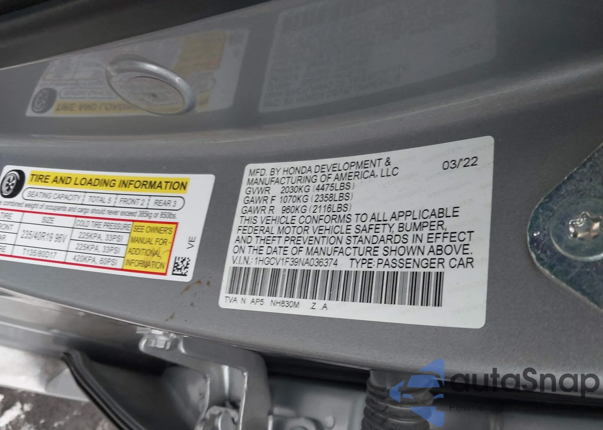 • VIN 1HGCV1F39NA036374