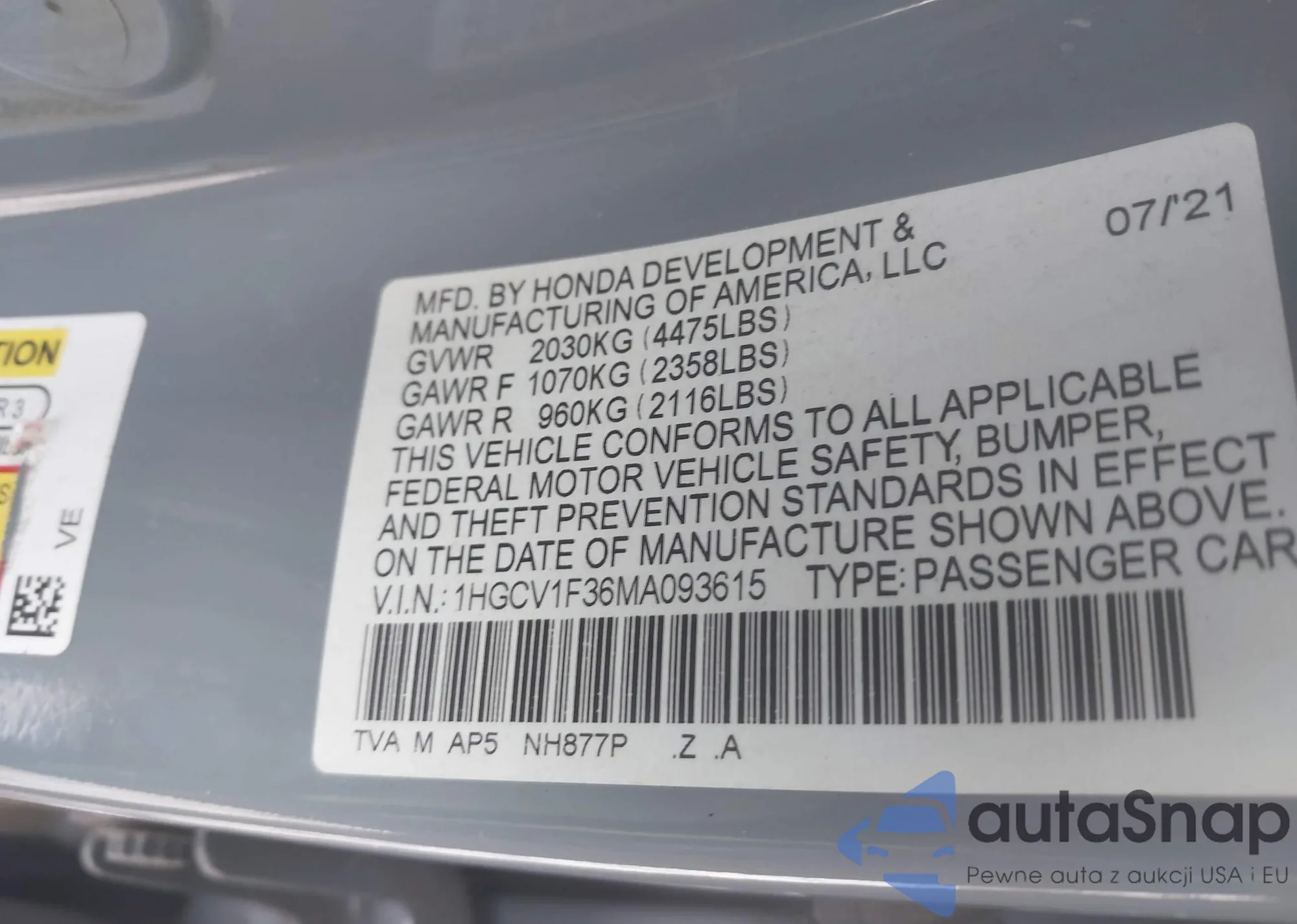 LOT: 43893454 VIN: 1HGCV1F36MA093615