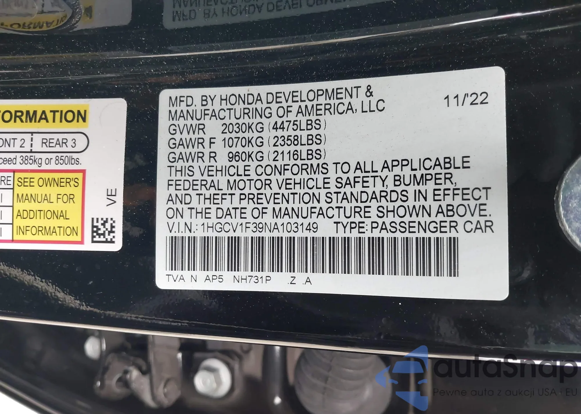 • VIN 1HGCV1F39NA103149