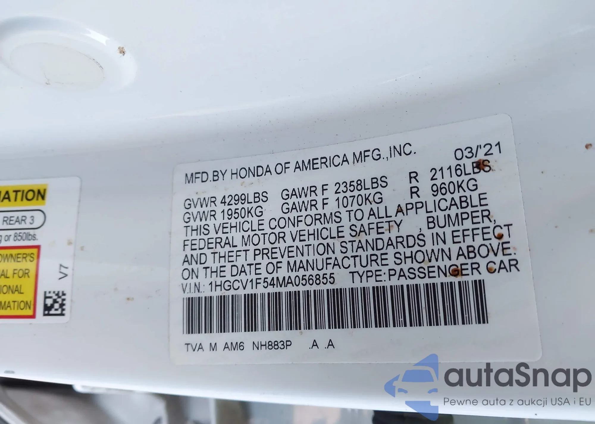 LOT: 44143575 VIN: 1HGCV1F54MA056855