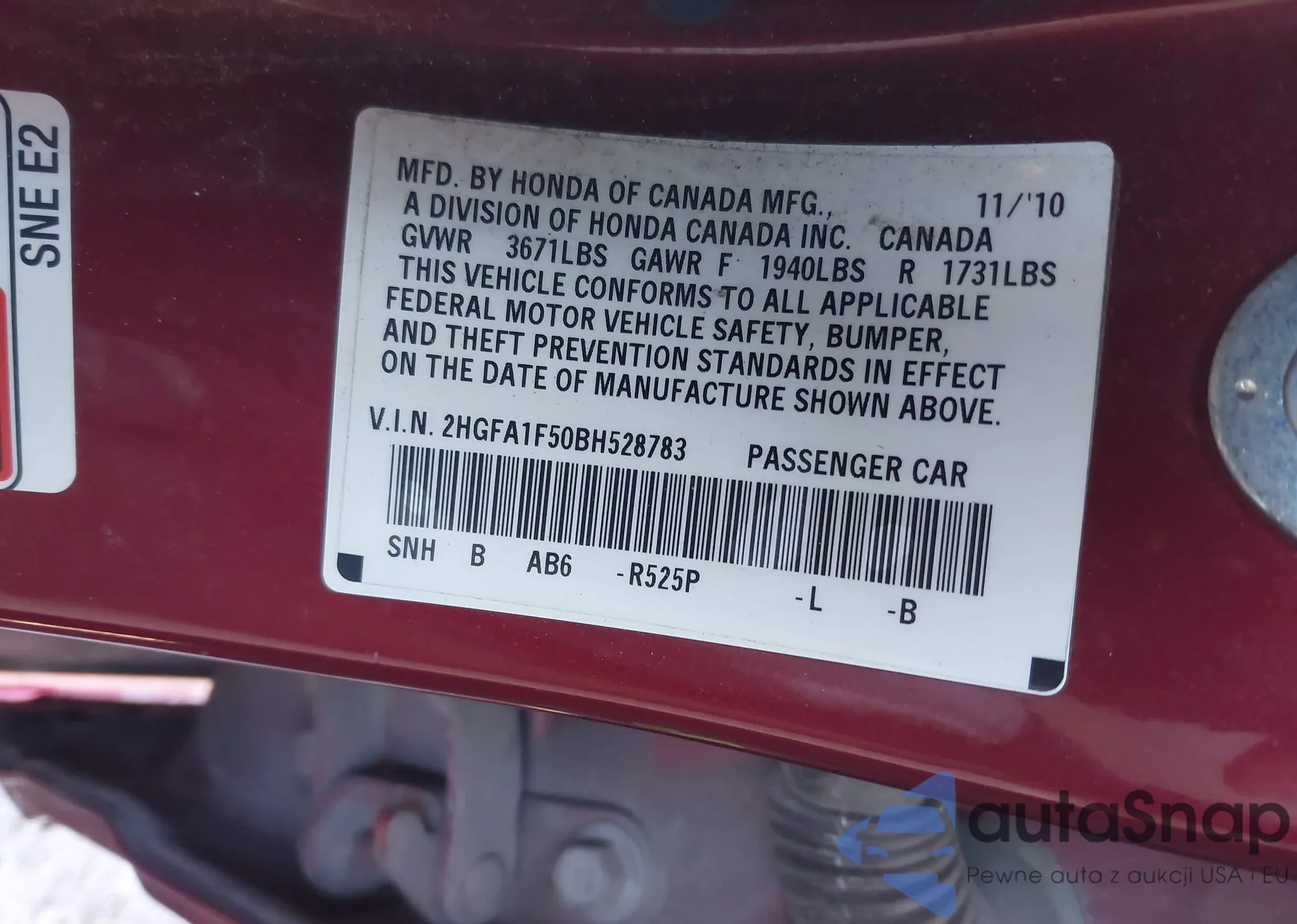 • VIN 2HGFA1F50BH528783