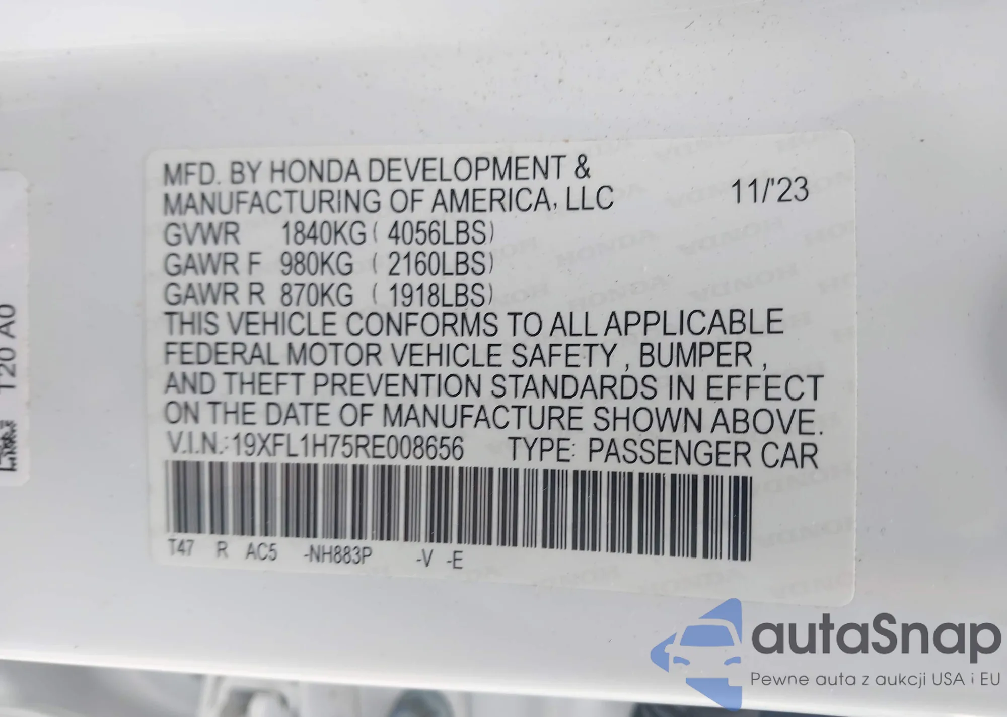 • VIN 19XFL1H75RE008656