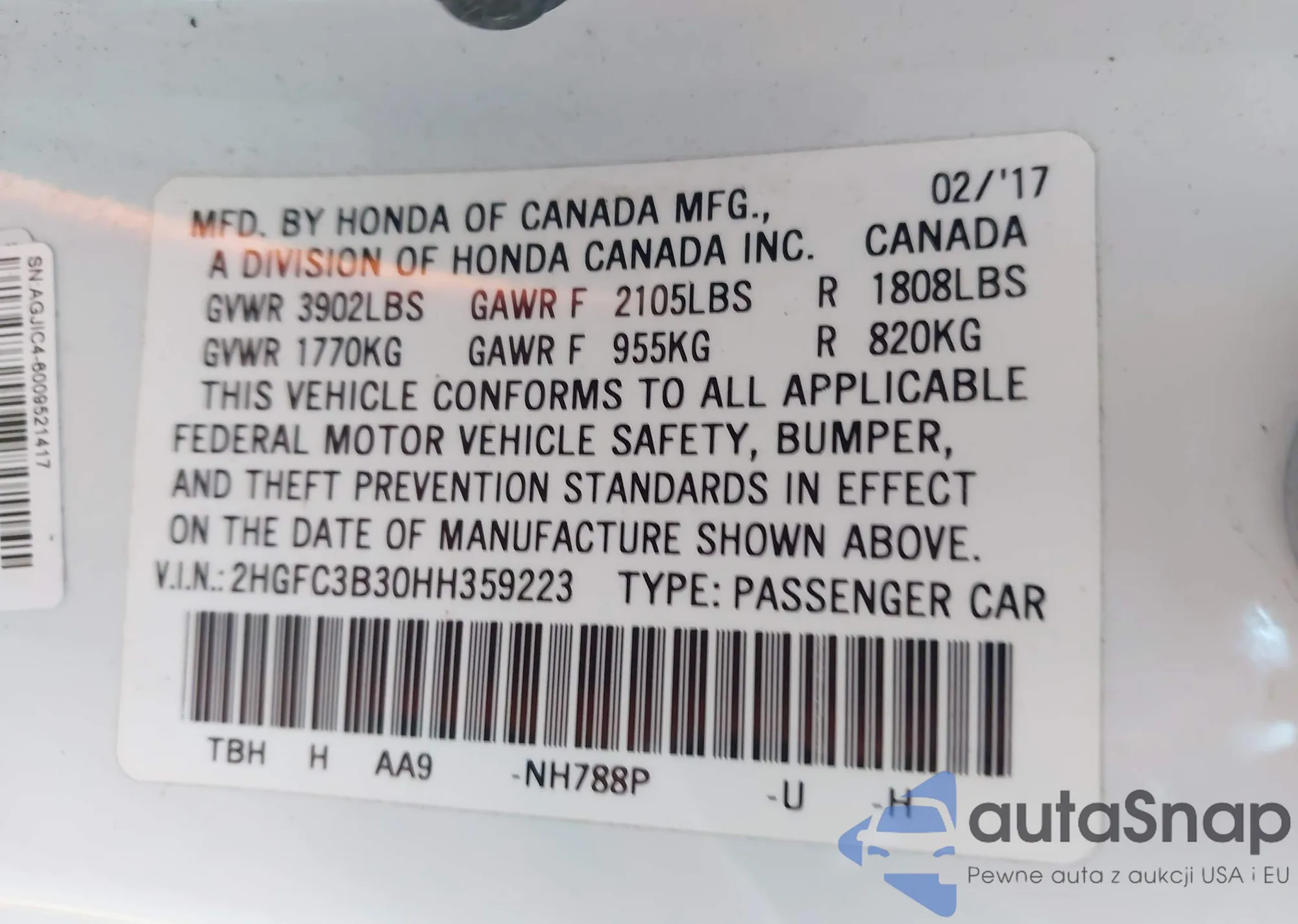• VIN 2HGFC3B30HH359223