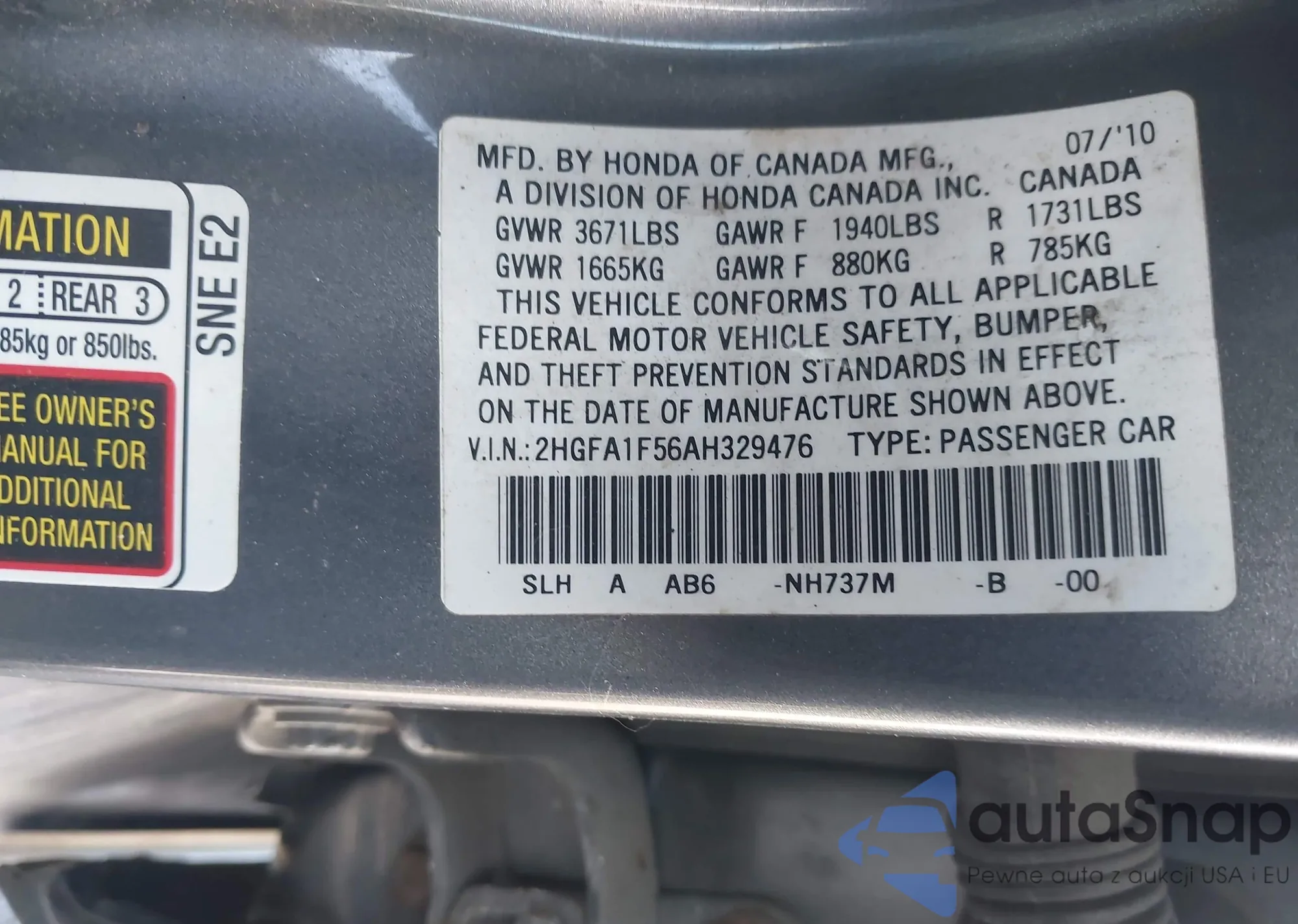 • VIN 2HGFA1F56AH329476