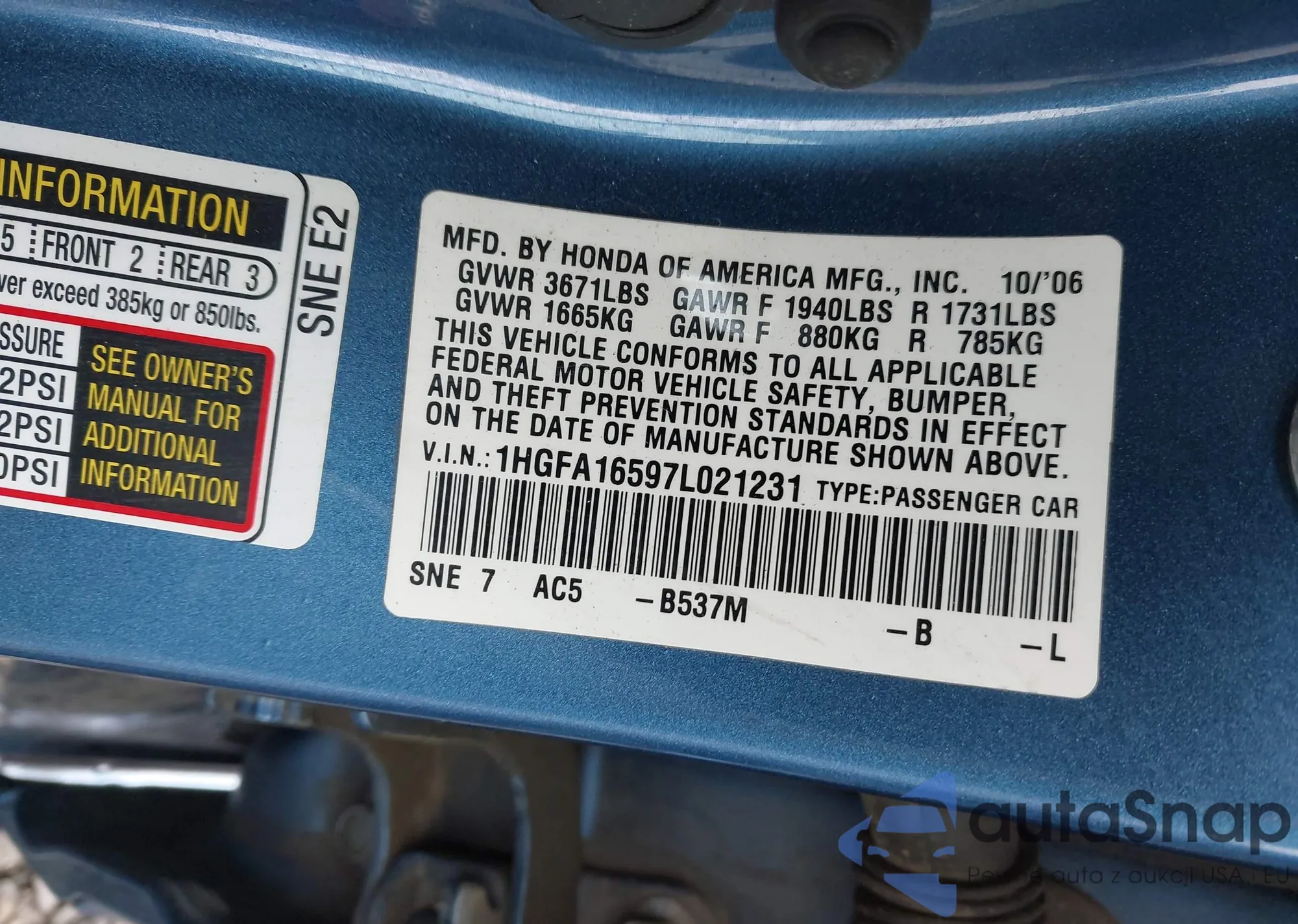 LOT: 44339253 VIN: 1HGFA16597L021231