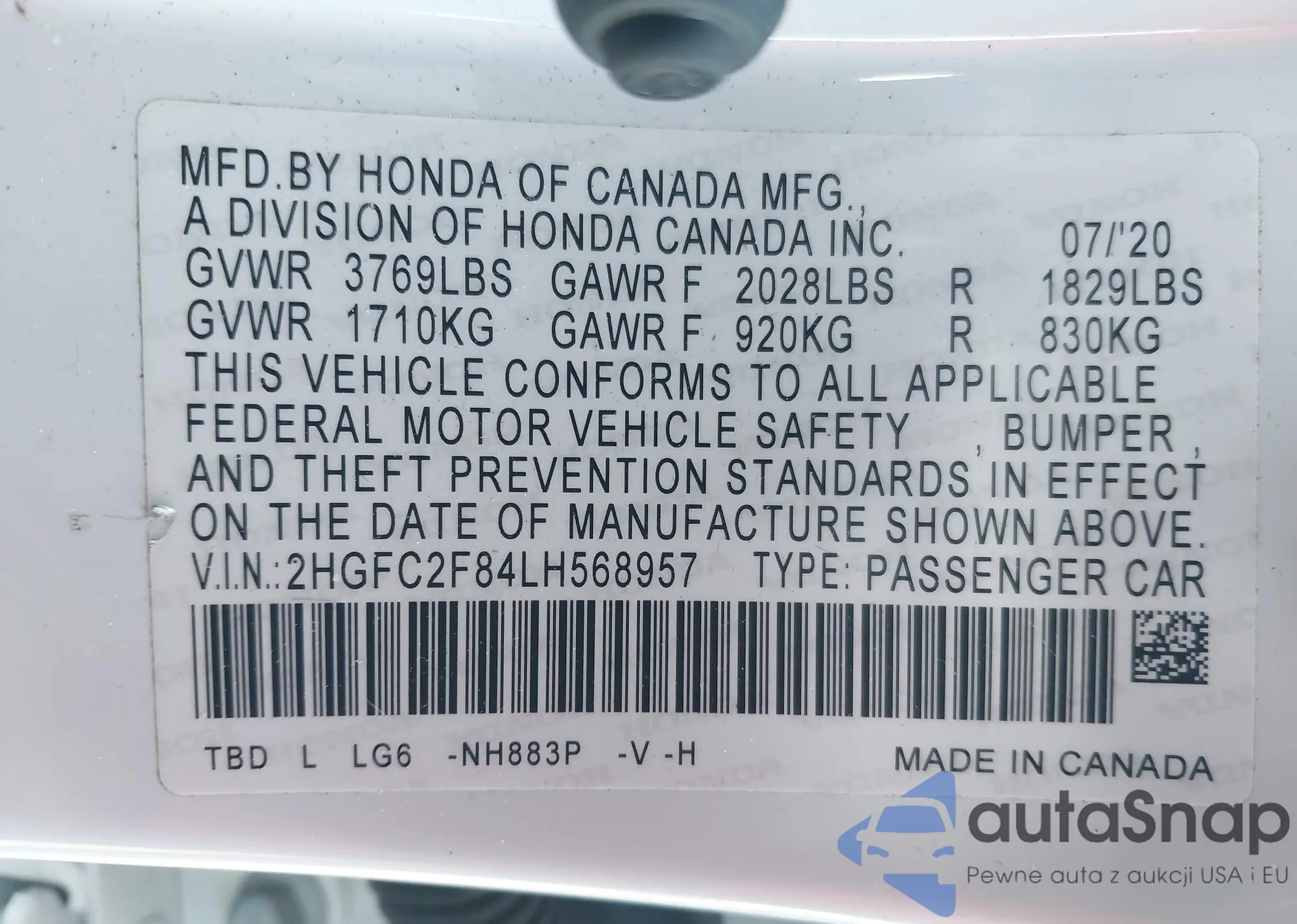 • VIN 2HGFC2F84LH568957