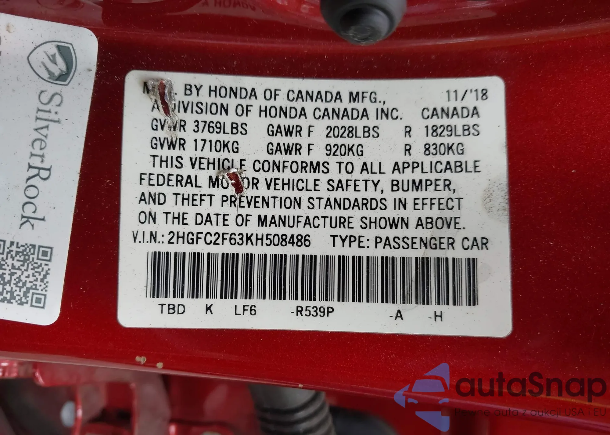 • VIN 2HGFC2F63KH508486