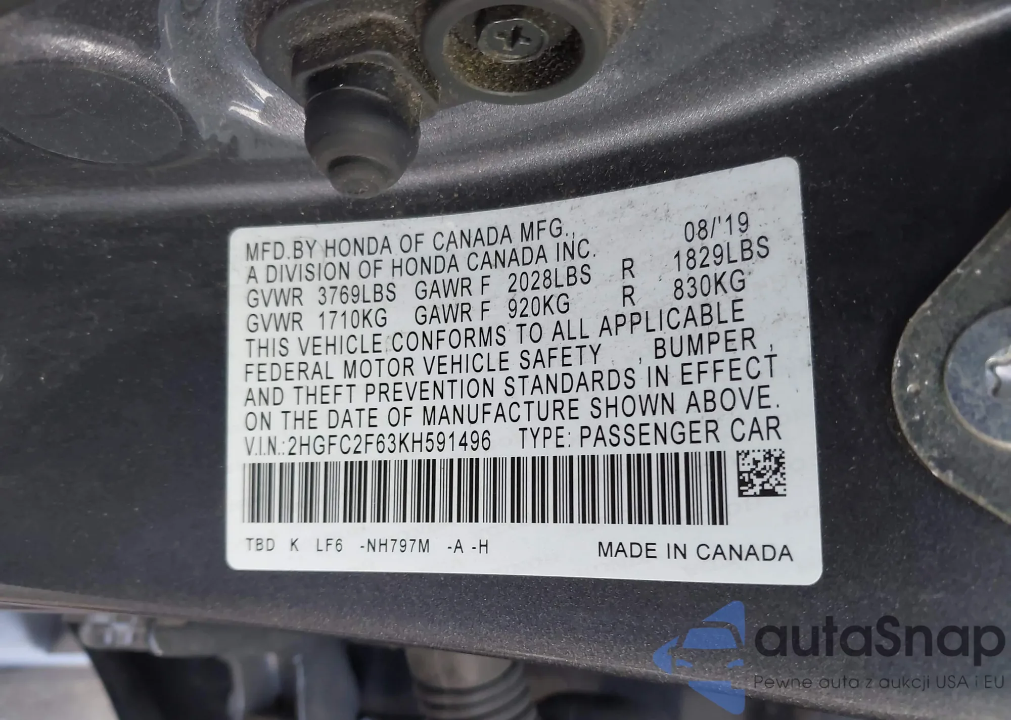 • VIN 2HGFC2F63KH591496