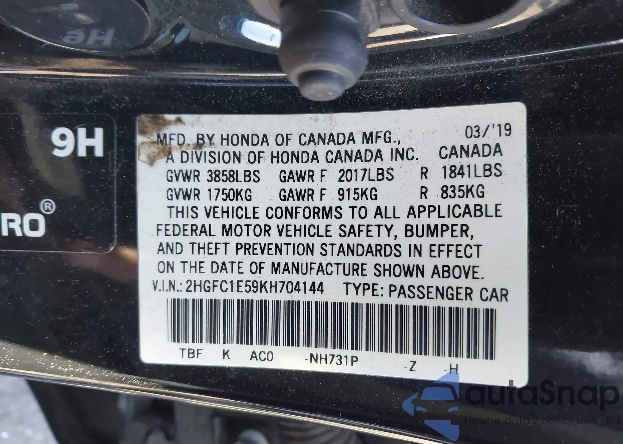 • VIN 2HGFC1E59KH704144