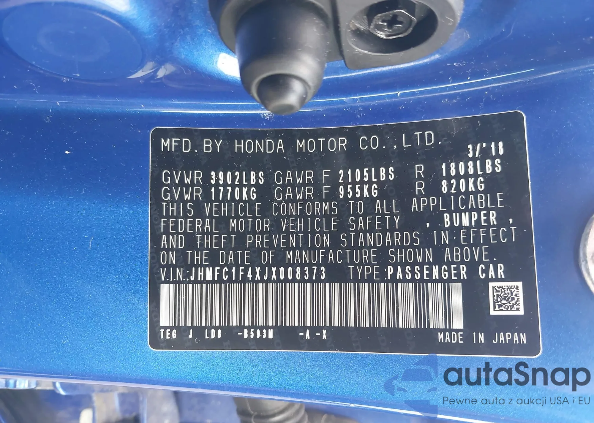 • VIN 2HGFC3B96JH350312