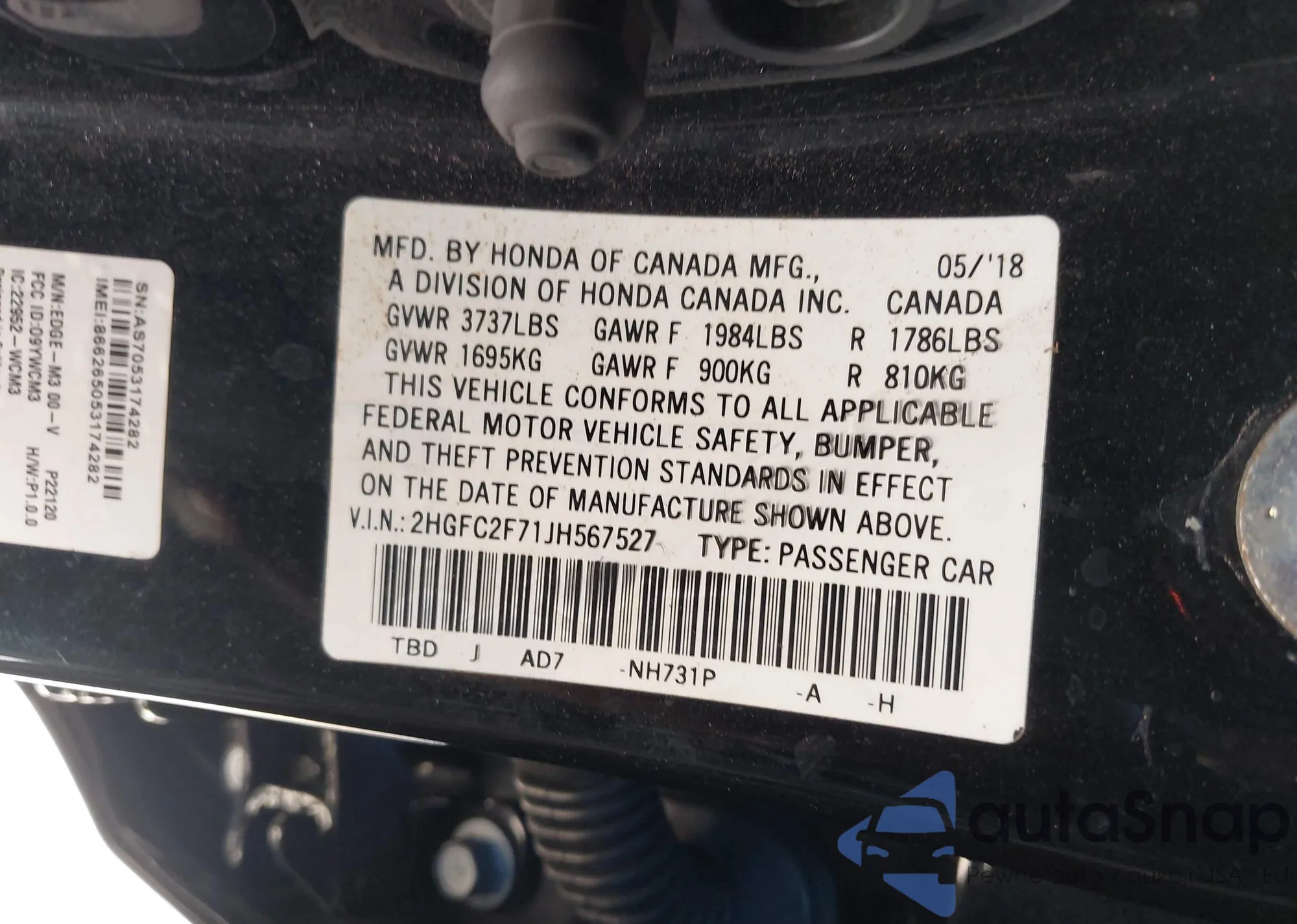 • VIN 2HGFC2F71JH567527