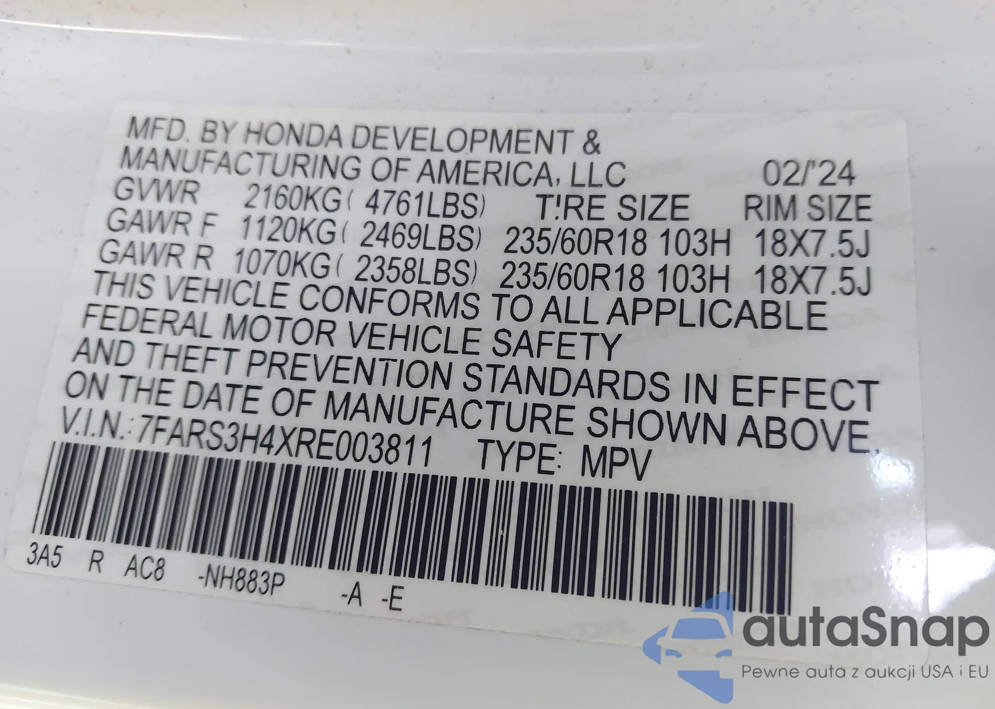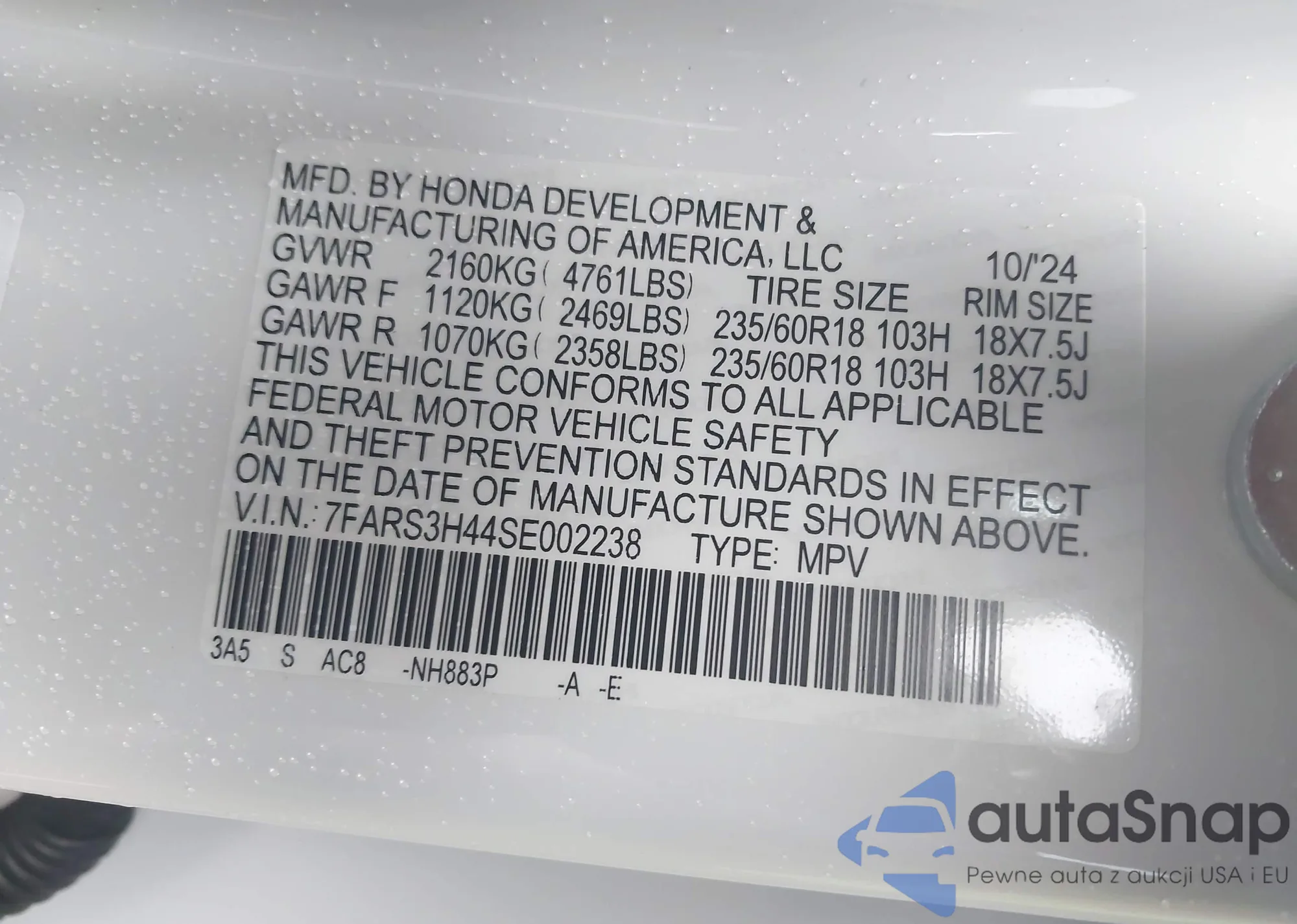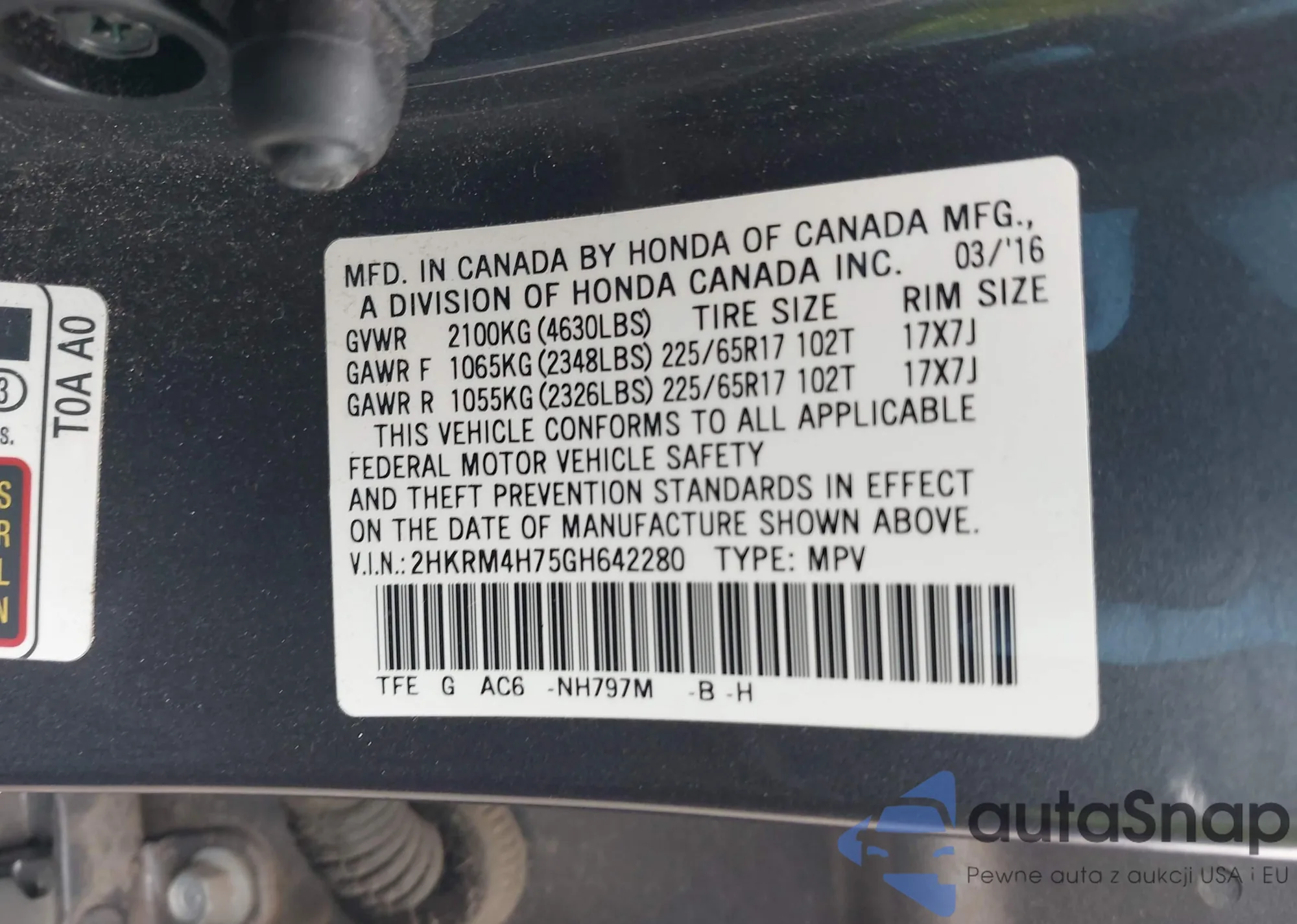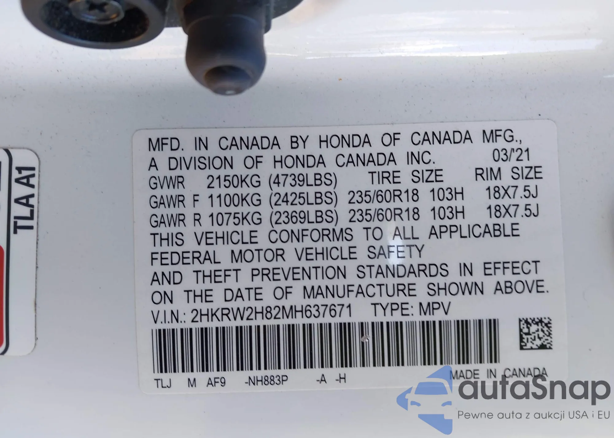 • VIN 2HKRW2H82MH637671
