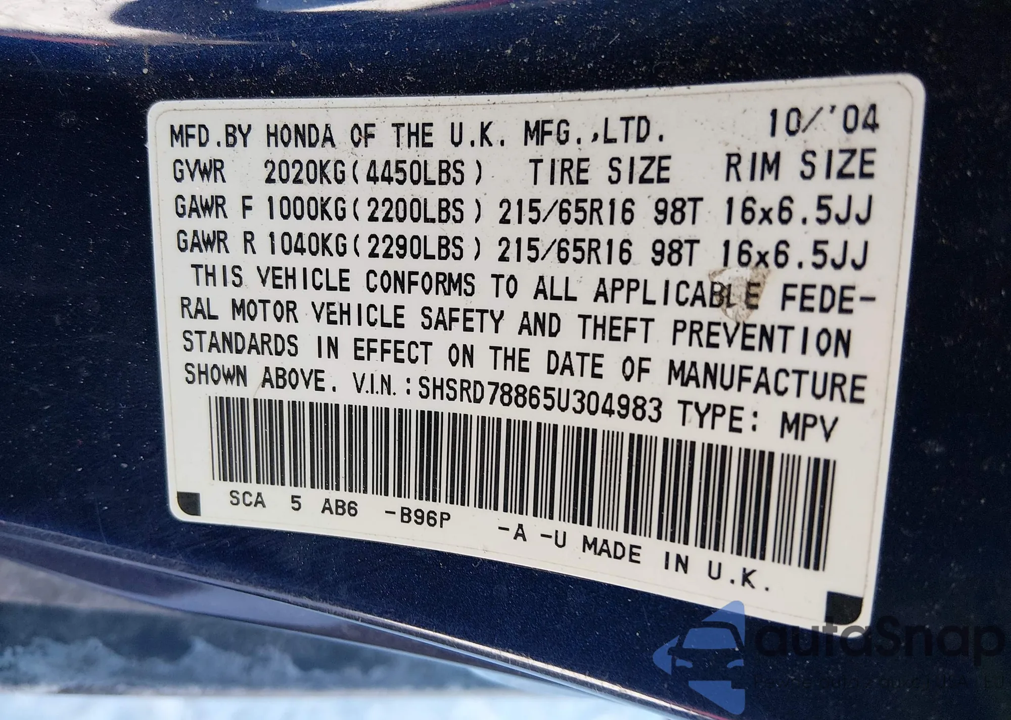 • VIN SHSRD78865U304983