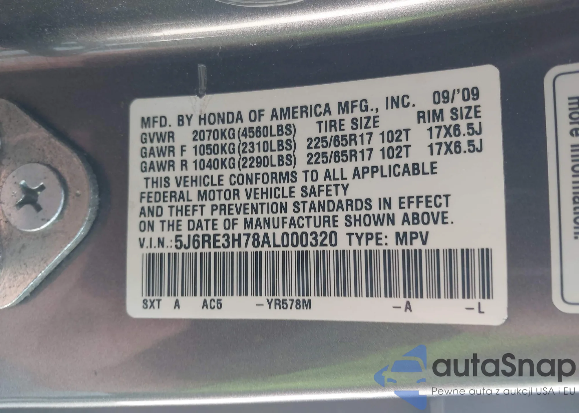 • VIN 5J6RE3H78AL000320