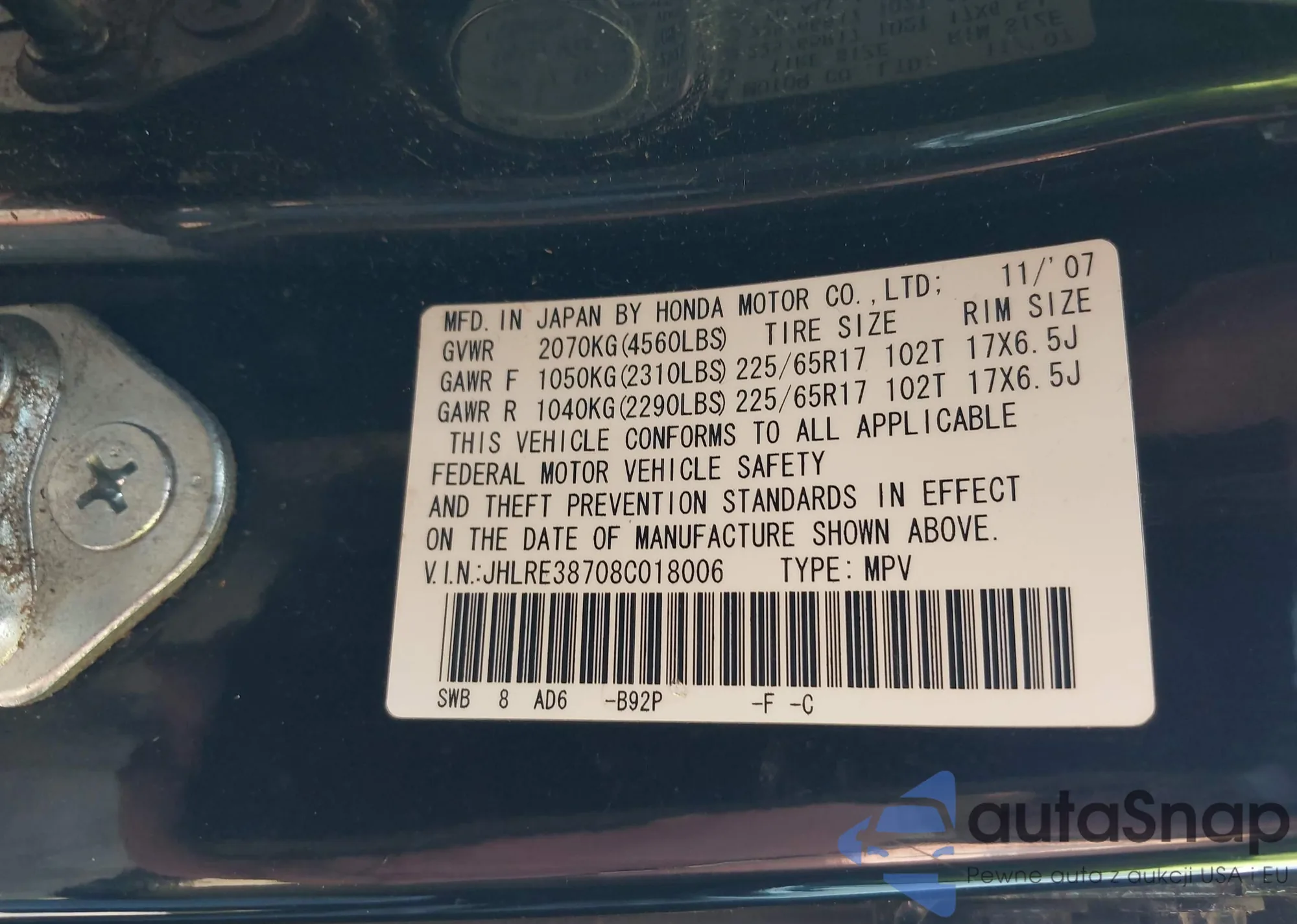 LOT: 43157669 VIN: JHLRE38708C018006