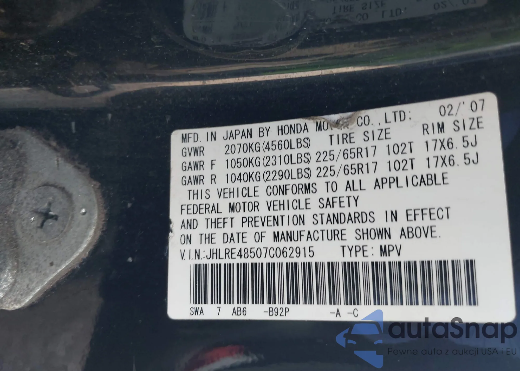 • VIN JHLRE48507C062915