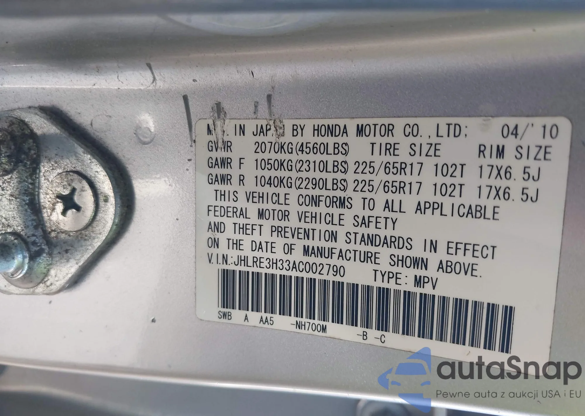 LOT: 43792651 VIN: JHLRE3H33AC002790