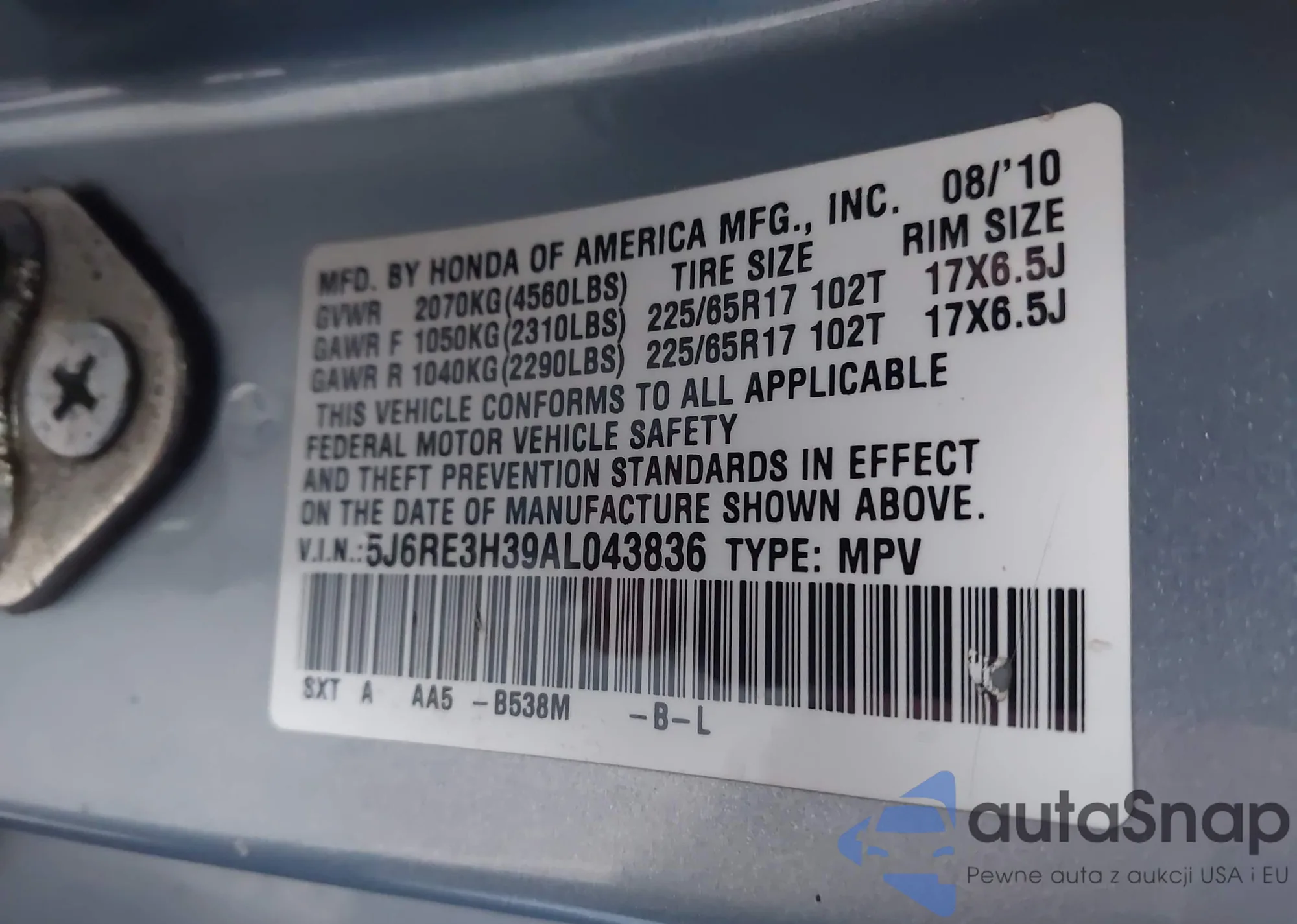 • VIN 5J6RE3H39AL043836