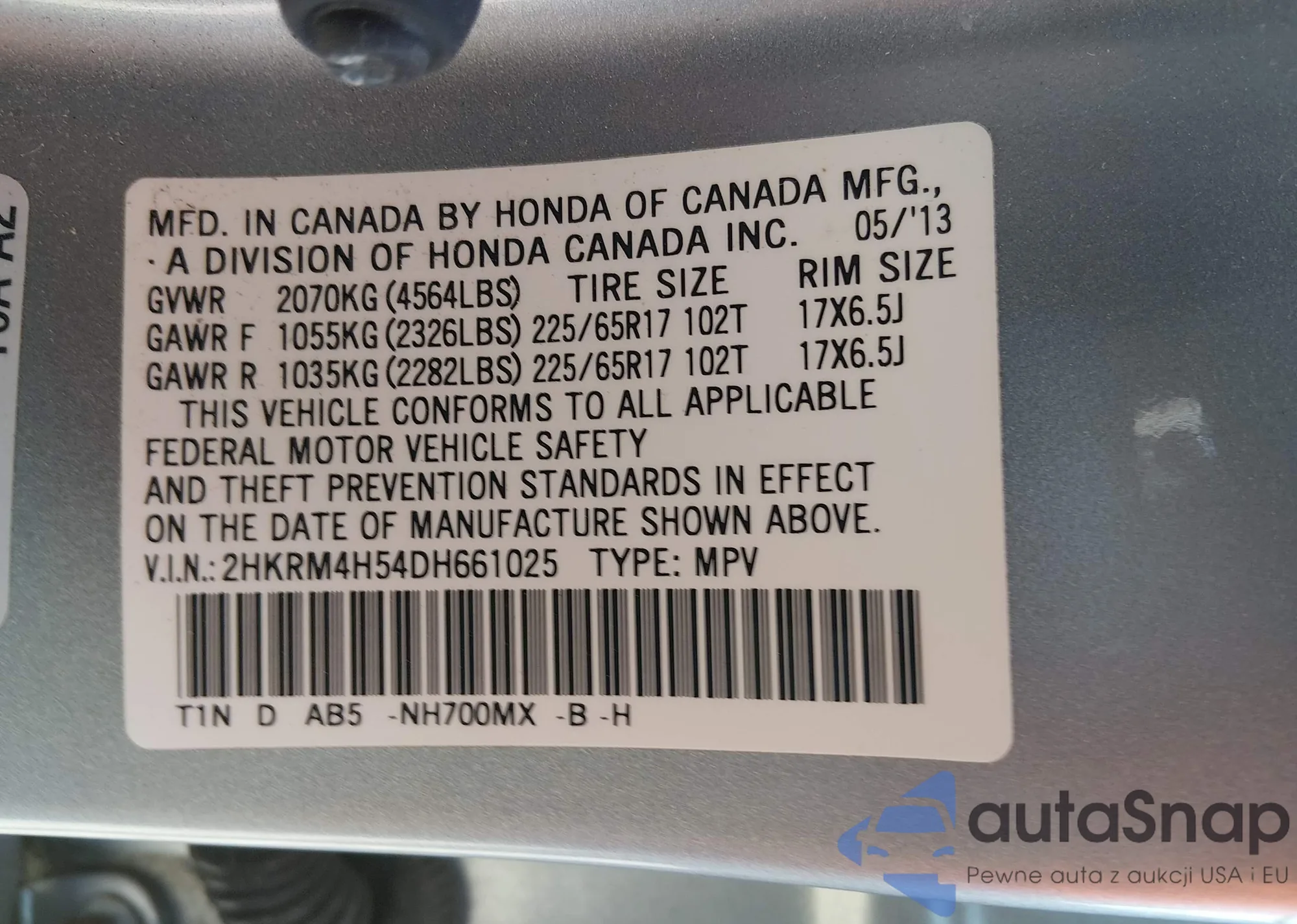 • VIN 2HKRM4H54DH661025