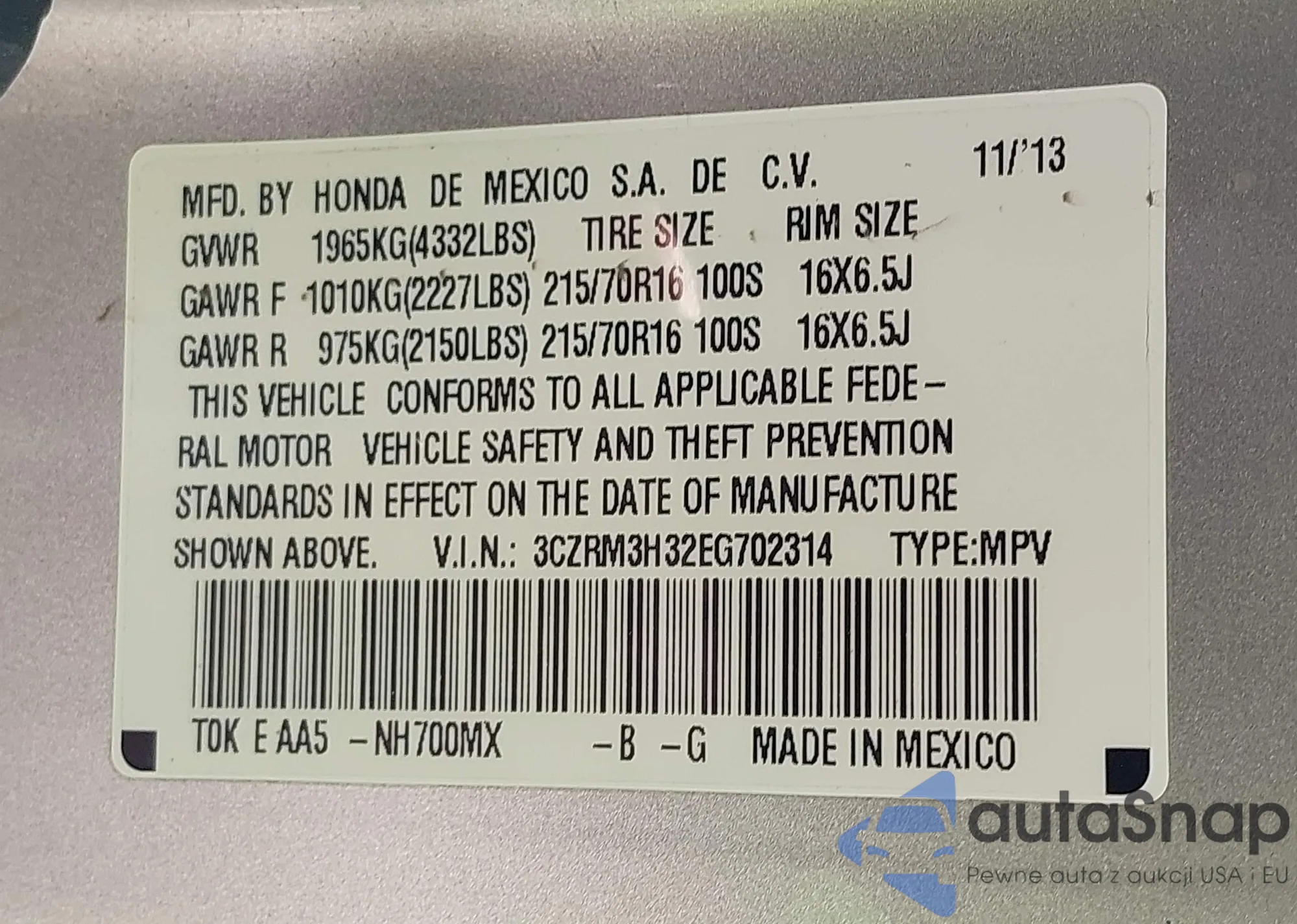 • VIN 3CZRM3H32EG702314