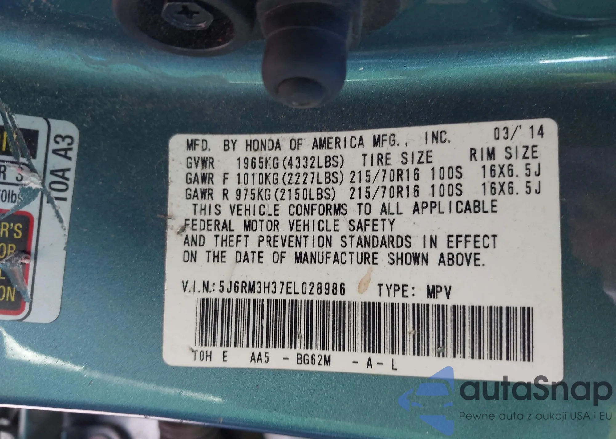 • VIN 5J6RM3H37EL028986