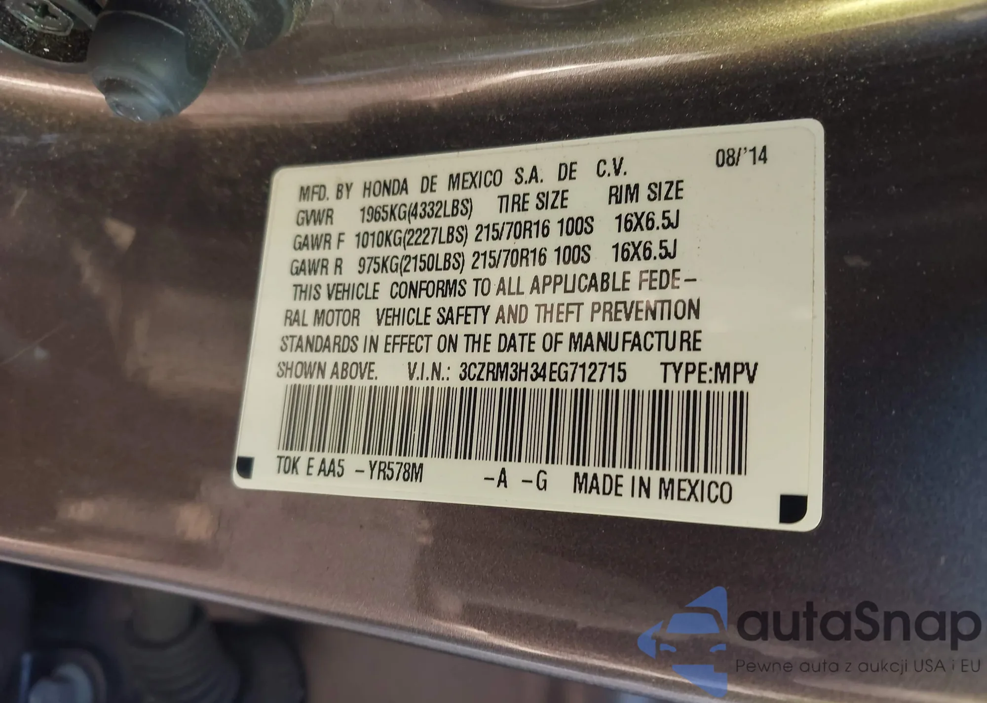 • VIN 5J6RM4H78EL021960