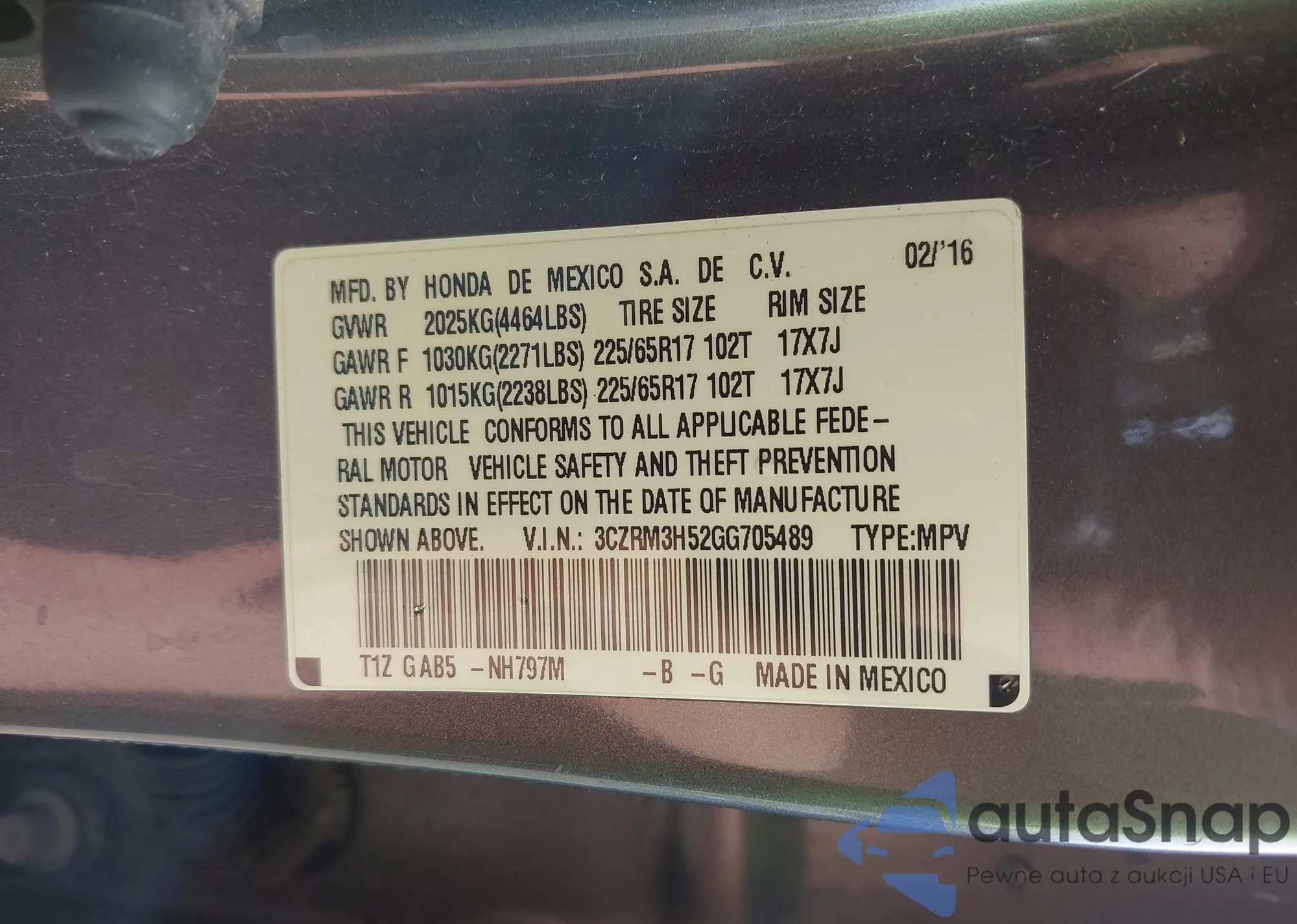 • VIN 5J6RM3H94GL032646