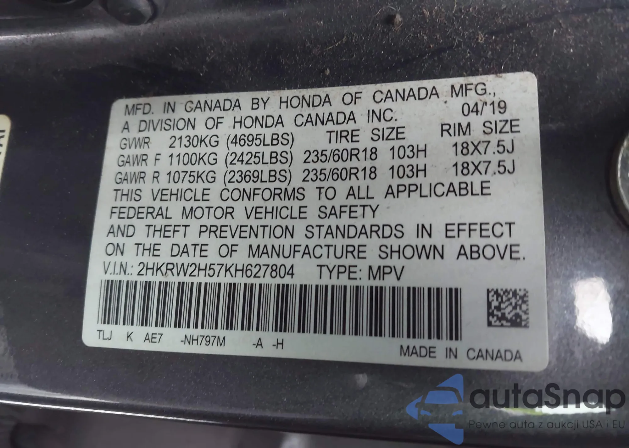 • VIN 2HKRW2H57KH627804