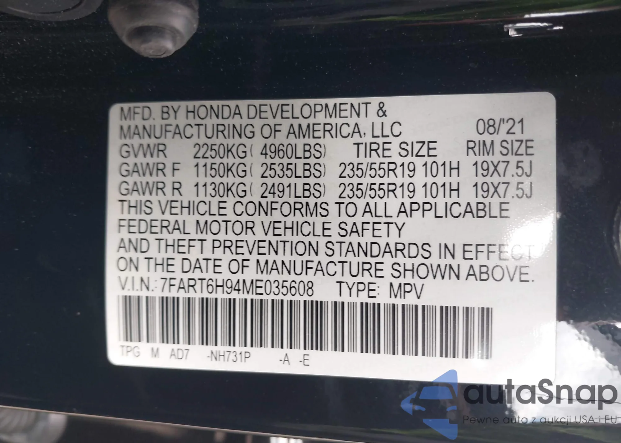 • VIN 5J6RW2H59MA005449