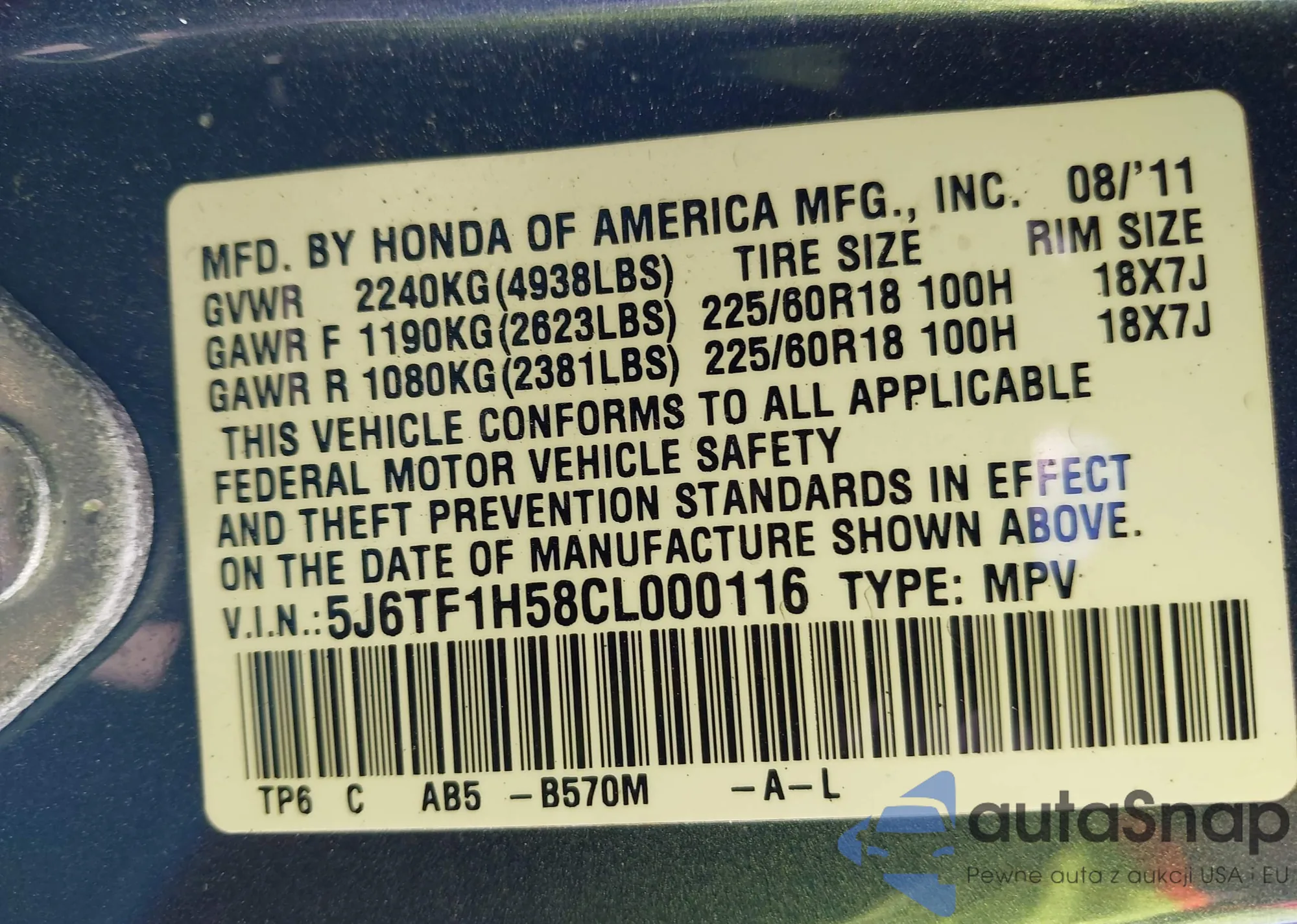 • VIN 5J6TF1H58CL000116