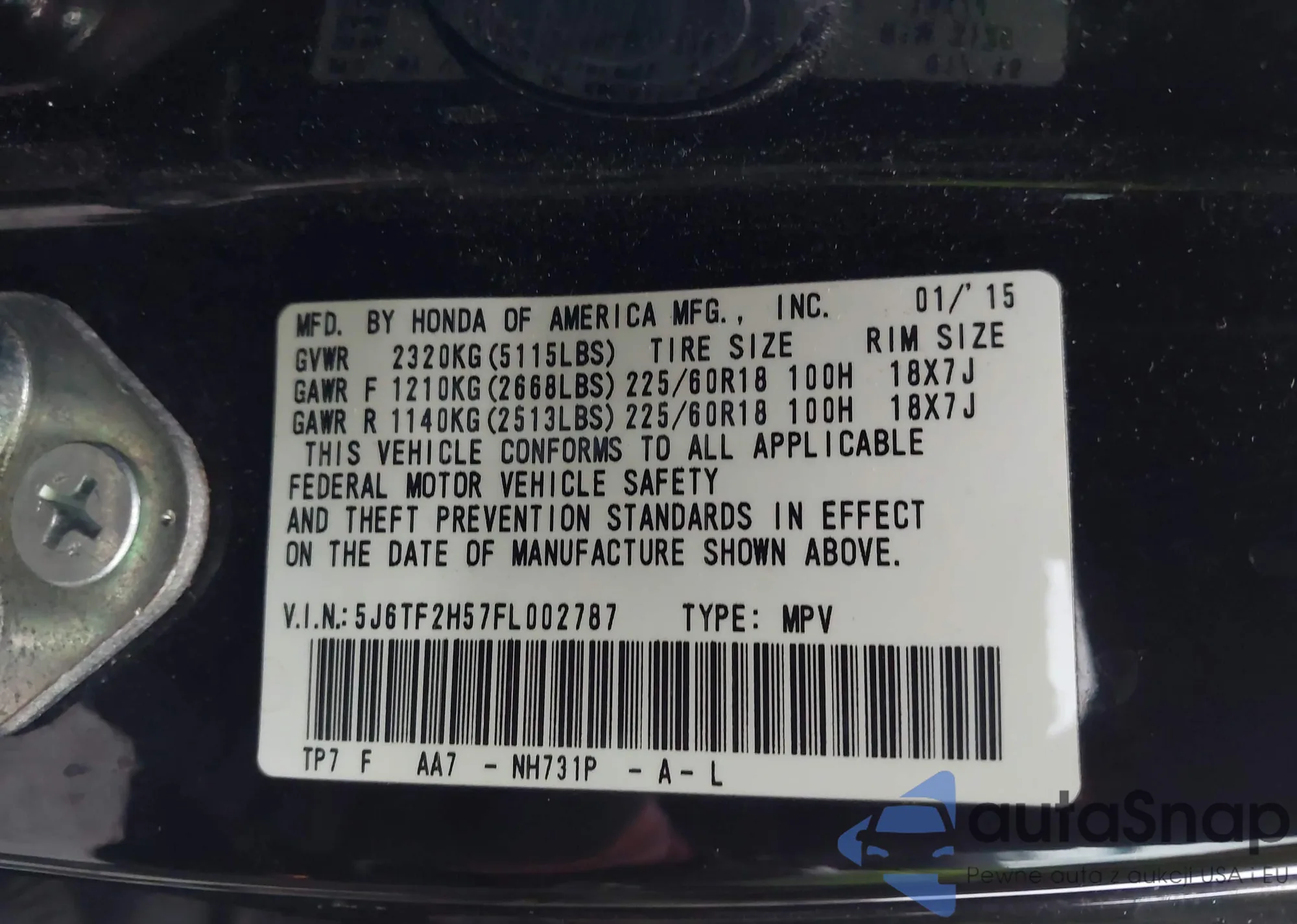 • VIN 5J6TF2H57FL002787