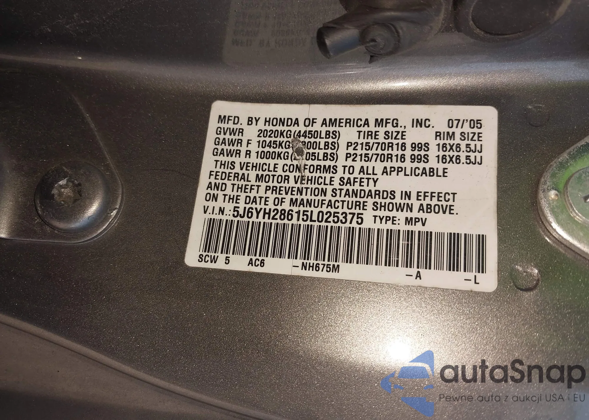 • VIN 5J6YH28615L025375