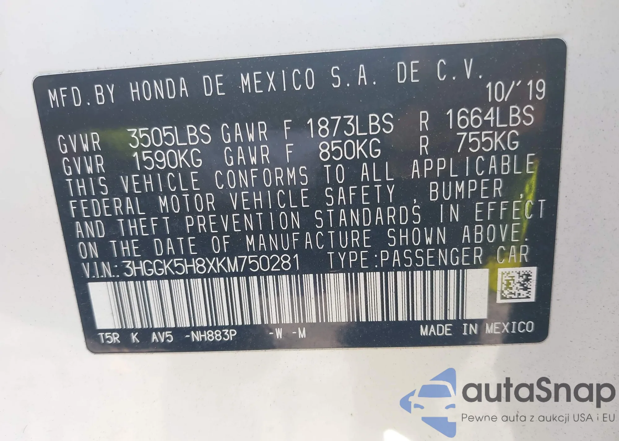 LOT: 44007226 VIN: 3HGGK5H8XKM750281