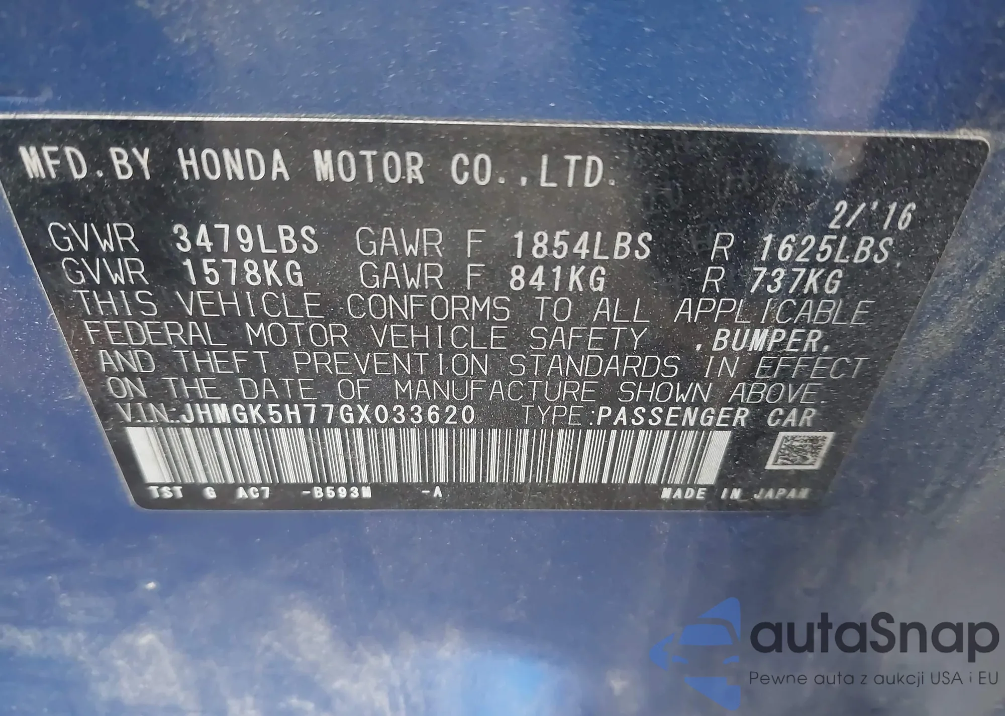 LOT: 44024669 VIN: JHMGK5H77GX033620