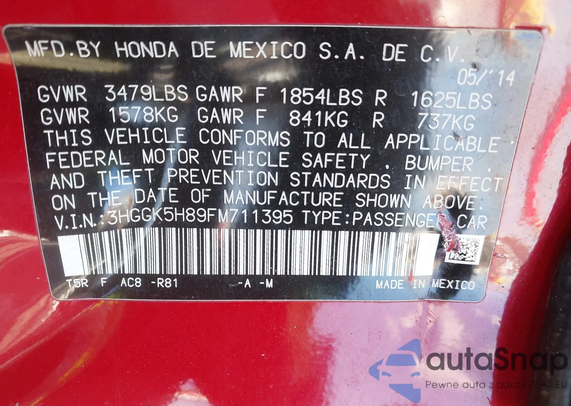 LOT: 43903881 VIN: 3HGGK5H89FM711395