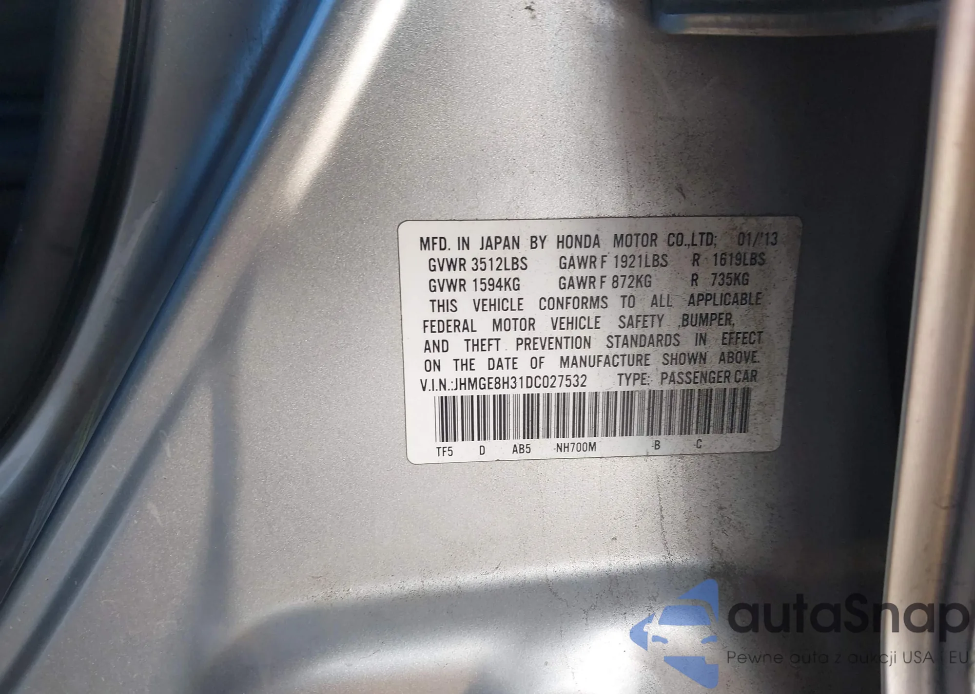 • VIN JHMGE8H31DC027532