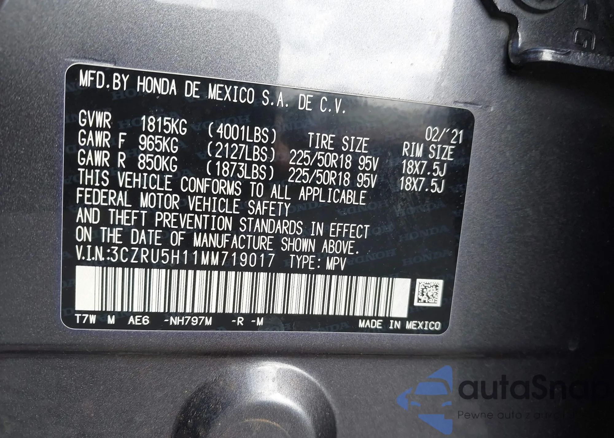 • VIN 3CZRU5H11MM719017