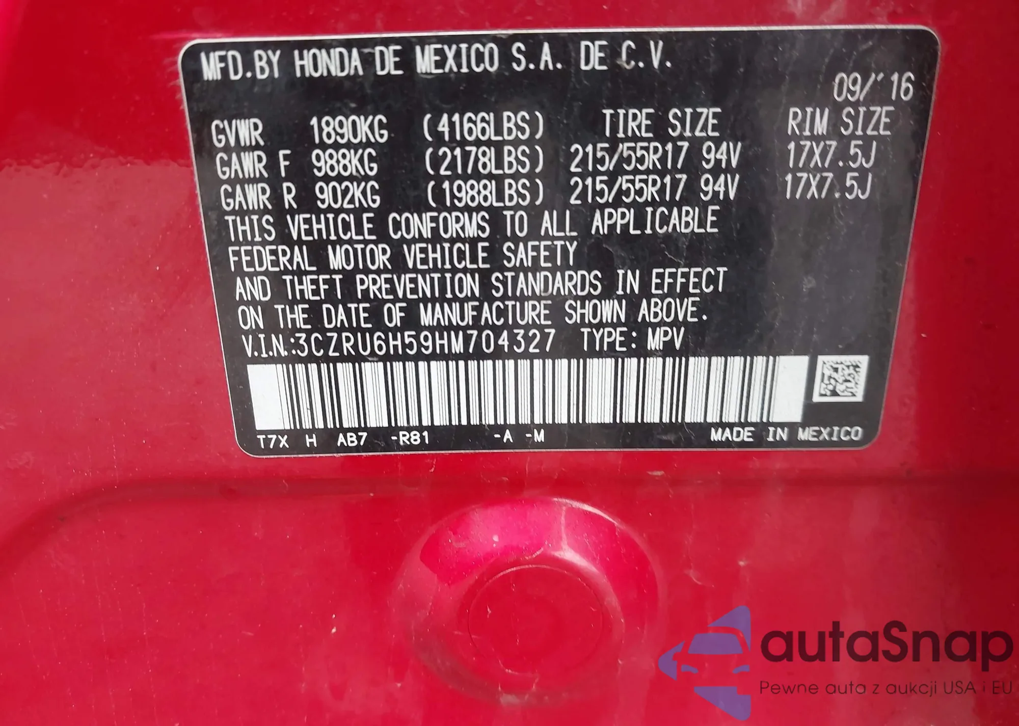 • VIN 3CZRU6H59HM704327