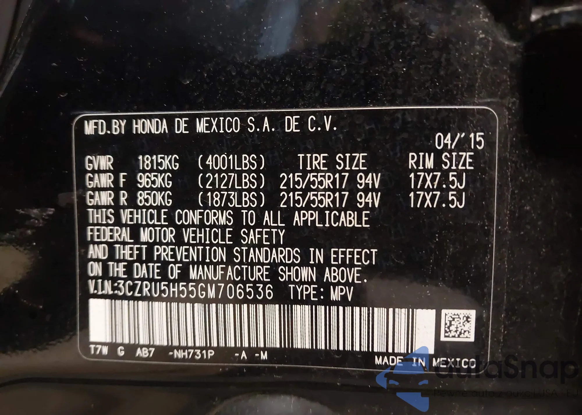 • VIN 3CZRU5H55GM706536