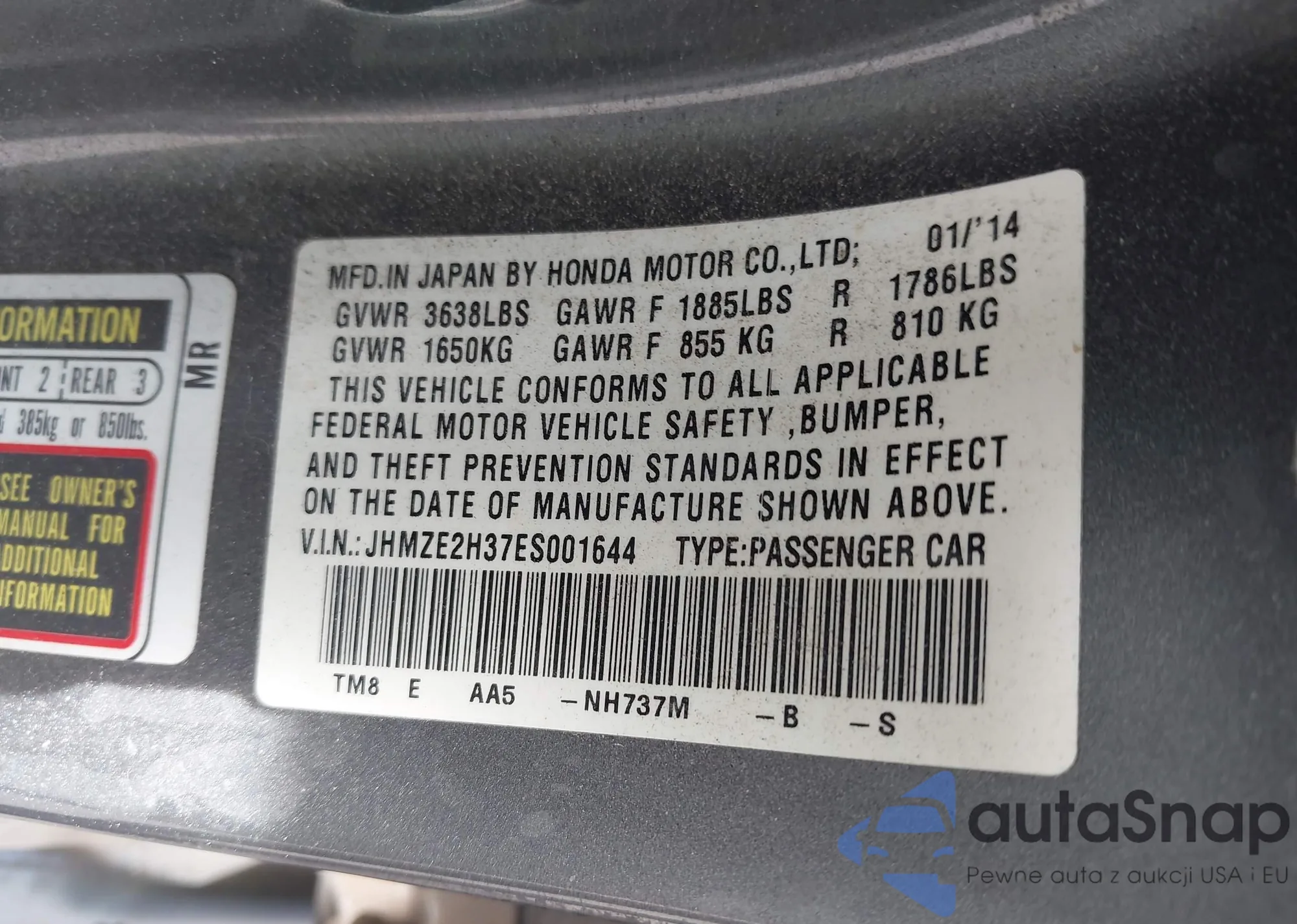 LOT: 43211357 VIN: JHMZE2H37ES001644
