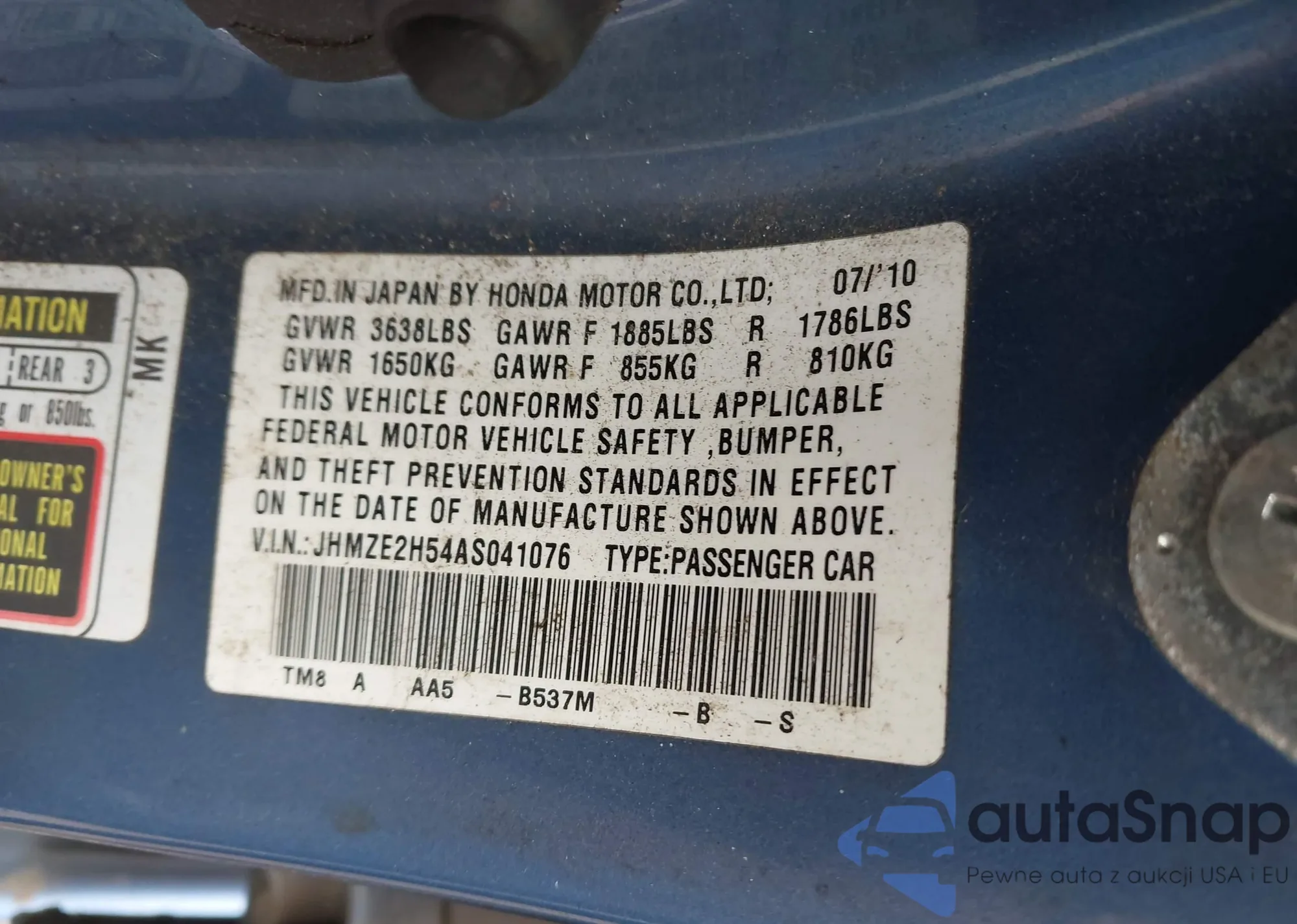 LOT: 43270462 VIN: JHMZE2H54AS041076