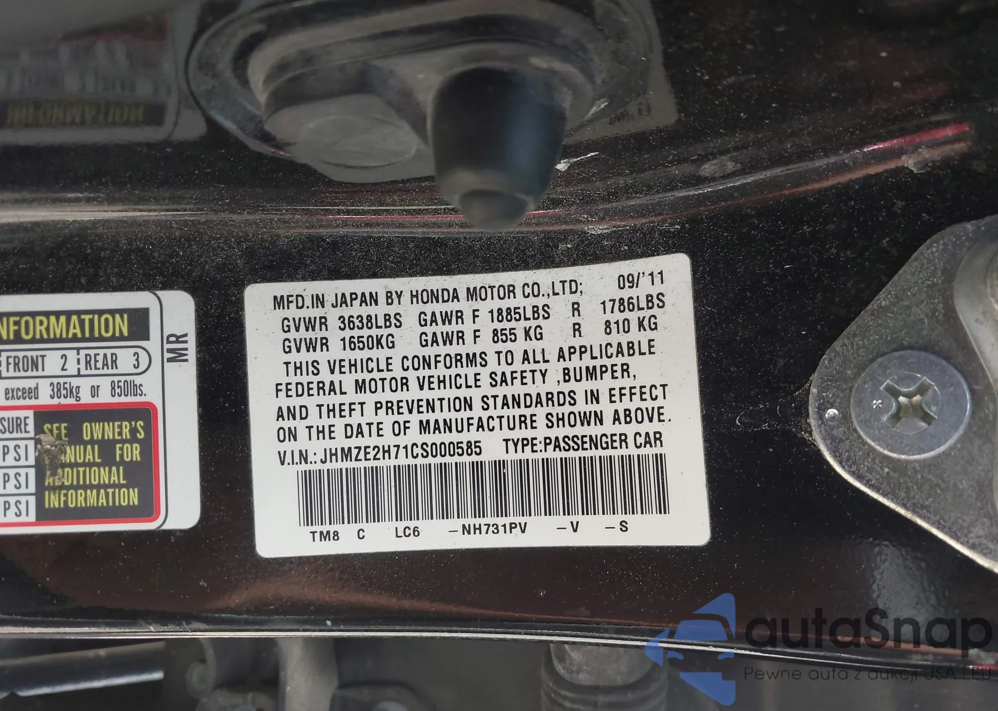 LOT: 42852211 VIN: JHMZE2H71CS000585