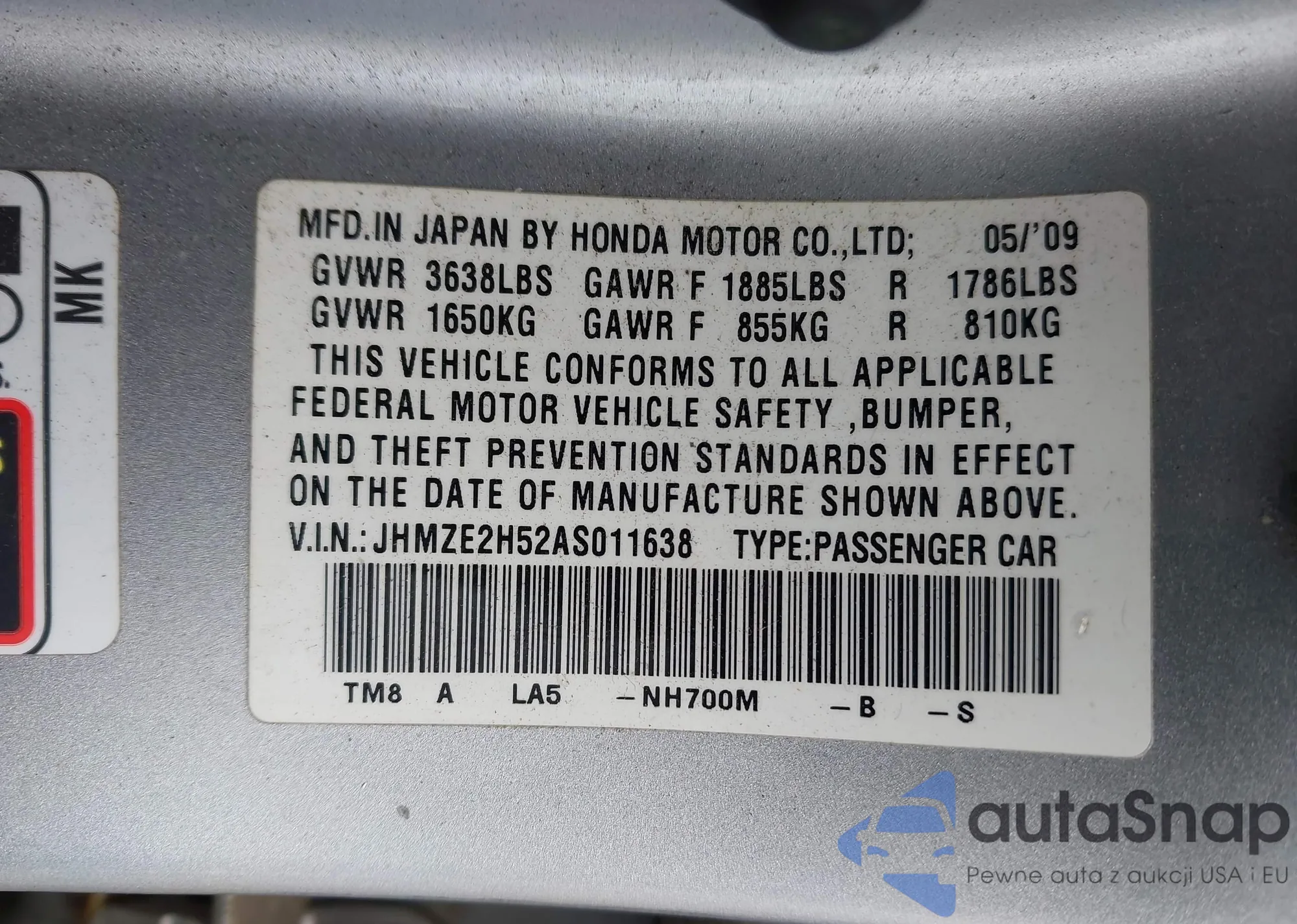 LOT: 92443685 VIN: JHMZE2H78AS035010